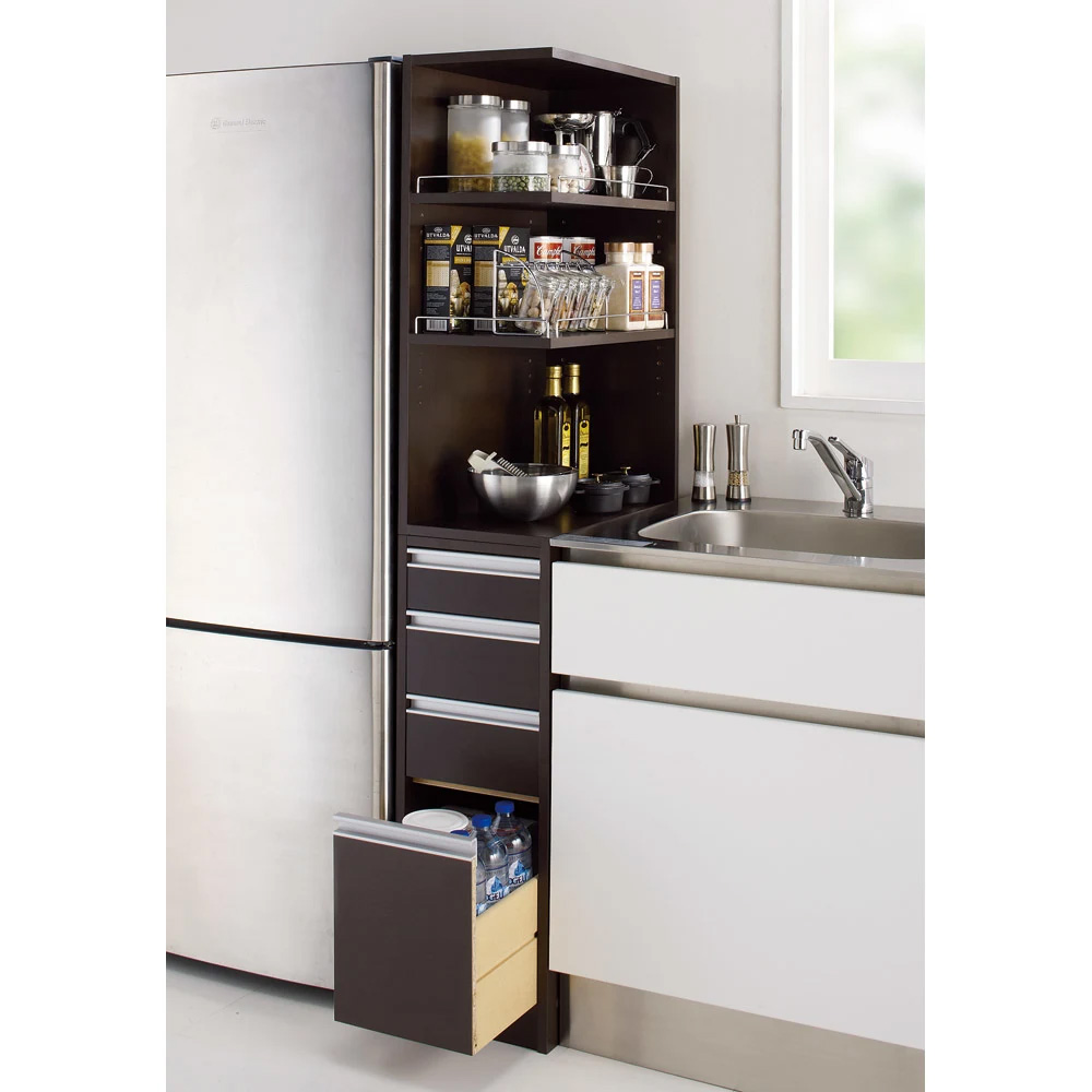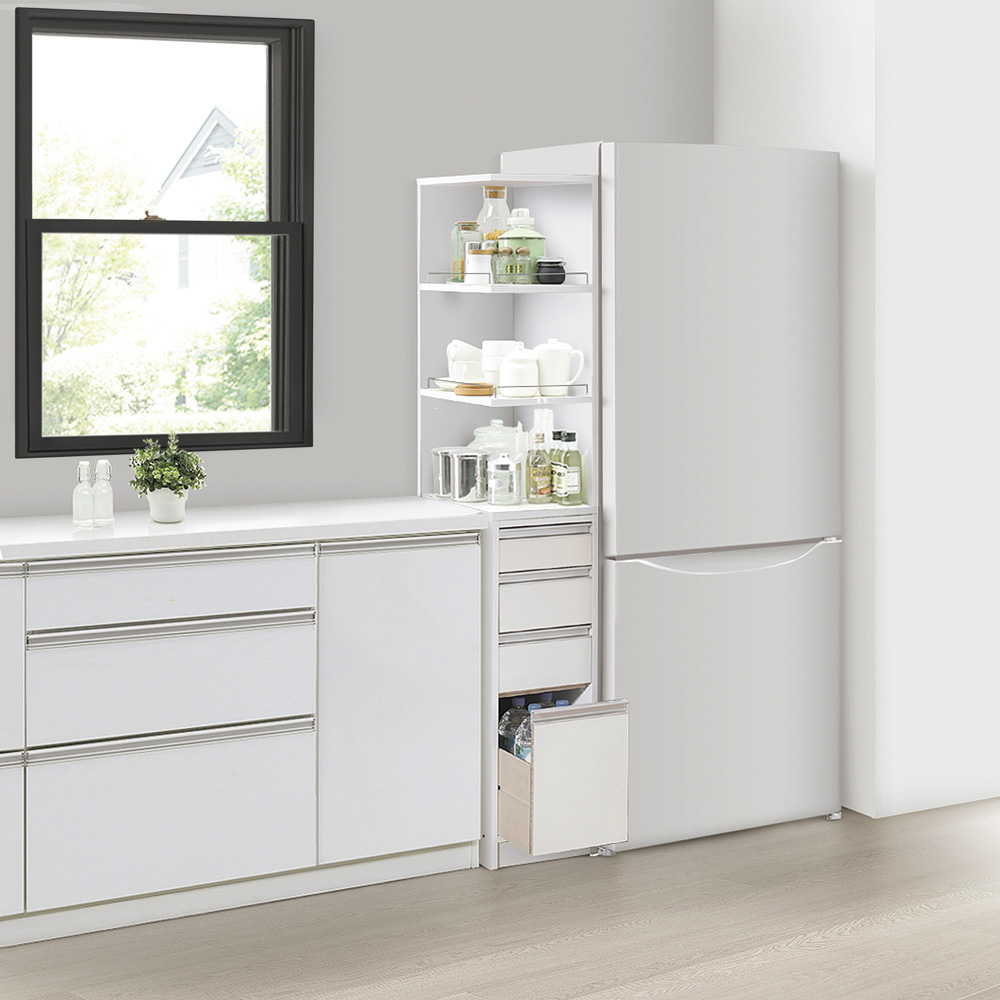 見せる収納にもなって取り出しやすいオープン棚付きの隙間収納ラック。わずか幅12cm〜30cmのシンクまわりや食器棚とのすき間を収納空間にする技あり収納術。上段は前からも横からもサッと取り出せる2面オープン棚で引き出しにはペットボトルも収納でき、狭いキッチンを使いやすくするアイデア収納家具です。良く使う物を取りやすい場所に。動線がスムーズになる便利なキッチン収納庫◆たった12cmからの隙間がキッチンストッカーに変身します。◆サイドオープン部には調味料や使う事の多いキッチンツールを取り出しやすく。◆スパイスラック、調味料ラックとしてもご使用頂けます。◆棚板は3cmピッチ5段階でそれぞれ調節可能。落下防止のこぼれ止めバー付きです。◆オープン棚の向きは組立時に左右どちら向きにも設定可能です。◆前面は光沢感があり、汚れにくく、お手入れし易い素材で作りました。(ポリエステル化粧合板)◆側面も化粧仕上げだからお掃除もラクラクで清潔感をキープできます。◆たった12cmの隙間から、大量収納スペースにしてしまうアイデア満載のすきま収納です。◆収納棚板の高さはお好みに合わせて調整できるので収納物に合わせて調整可能です。◆小物類の収納に便利な引き出しが4杯付。再下段はボトルも入る高さ設定です。◆洗面所の隙間収納としてもお使い頂けます。隙間家具でも妥協したくないあなたに高機能を◆選べる幅と奥行きのサイズ展開であなたのキッチンにピッタリなサイズをお選び下さい。◆棚板には収納物が落ちないように落下防止バーが付いています。(最下段は除きます)◆もちろんオープン部の向きは左右どちらでも設定可能で置く場所を選びません。◆上下連結式なので棚と引き出しを左右に並べてキッチンカウンターとしてもお使い頂けます。◆清潔感のあるホワイトでおしゃれなシンプルモダンキッチンを演出します。◆洗面所の隙間収納としてもお使い頂けます。信頼と安心の国内工場での生産品です◆国内の職人がひとつずつ丁寧に仕上げた逸品です。◆細部の丁寧な仕上がりなど、国産品ならではの高品質をお楽しみください。◆キッチンのすきまを無駄なく使いたいあなたにお勧めのキッチン収納ラックです。新築やリフォーム、模様替えの時にもおすすめの逸品◆お引越しや模様替えのタイミングでスペースを便利に有効活用してみませんか?◆高価な備え付け家具やリフォームよりも、リーズナブルに新生活を始められます。◆是非普段使うものこそ、大好きなものをじっくりとご検討下さい。