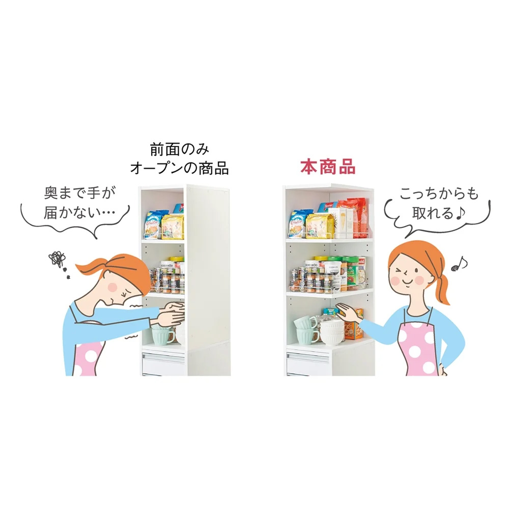 前からも横からも取り出せます。 ◎オープン部の向きは左右どちらにでも設定できます。 ◎棚板は3cm間隔で可動します。