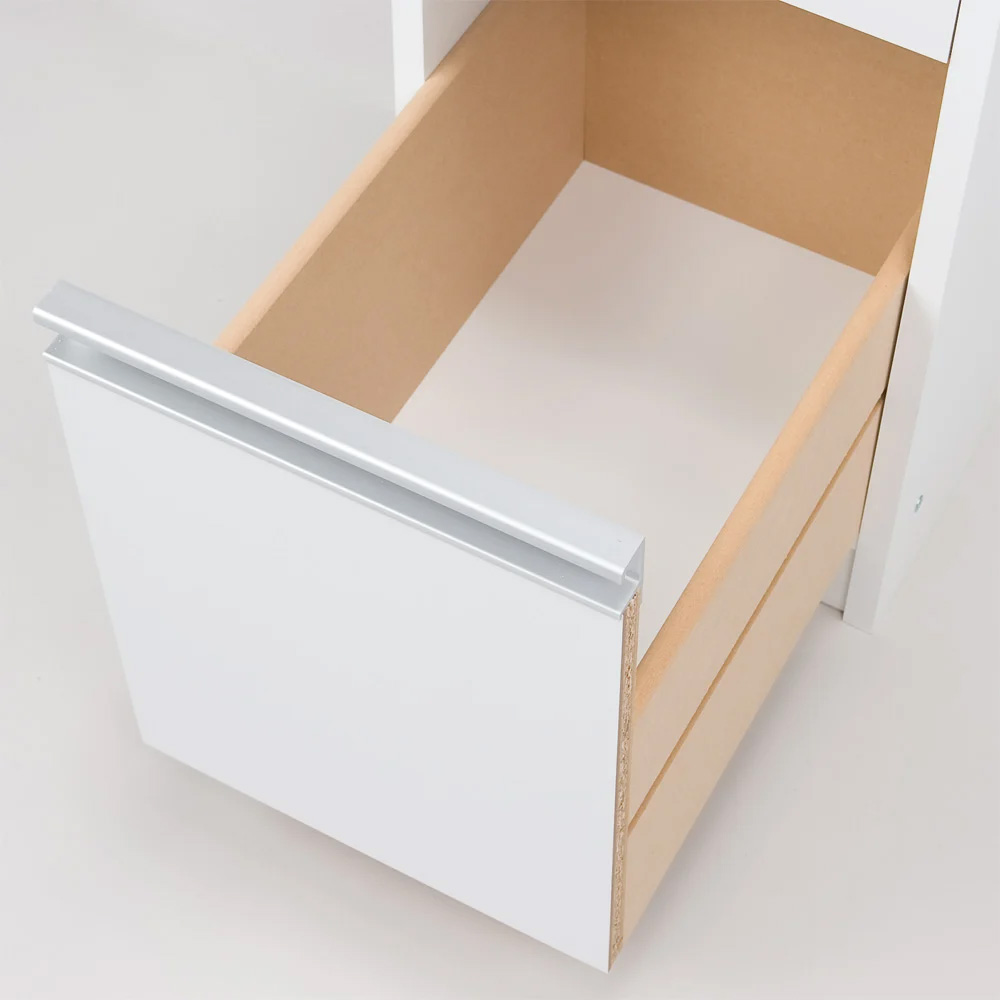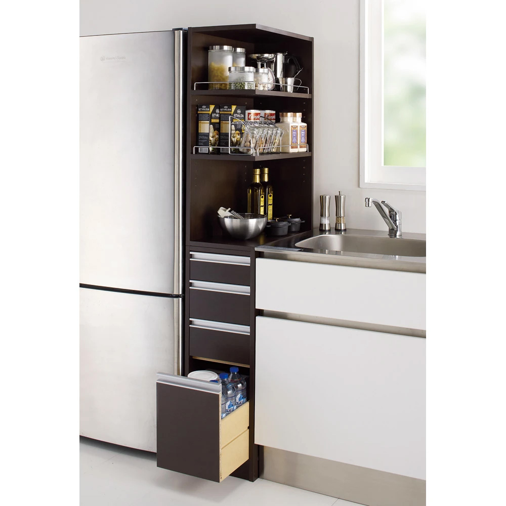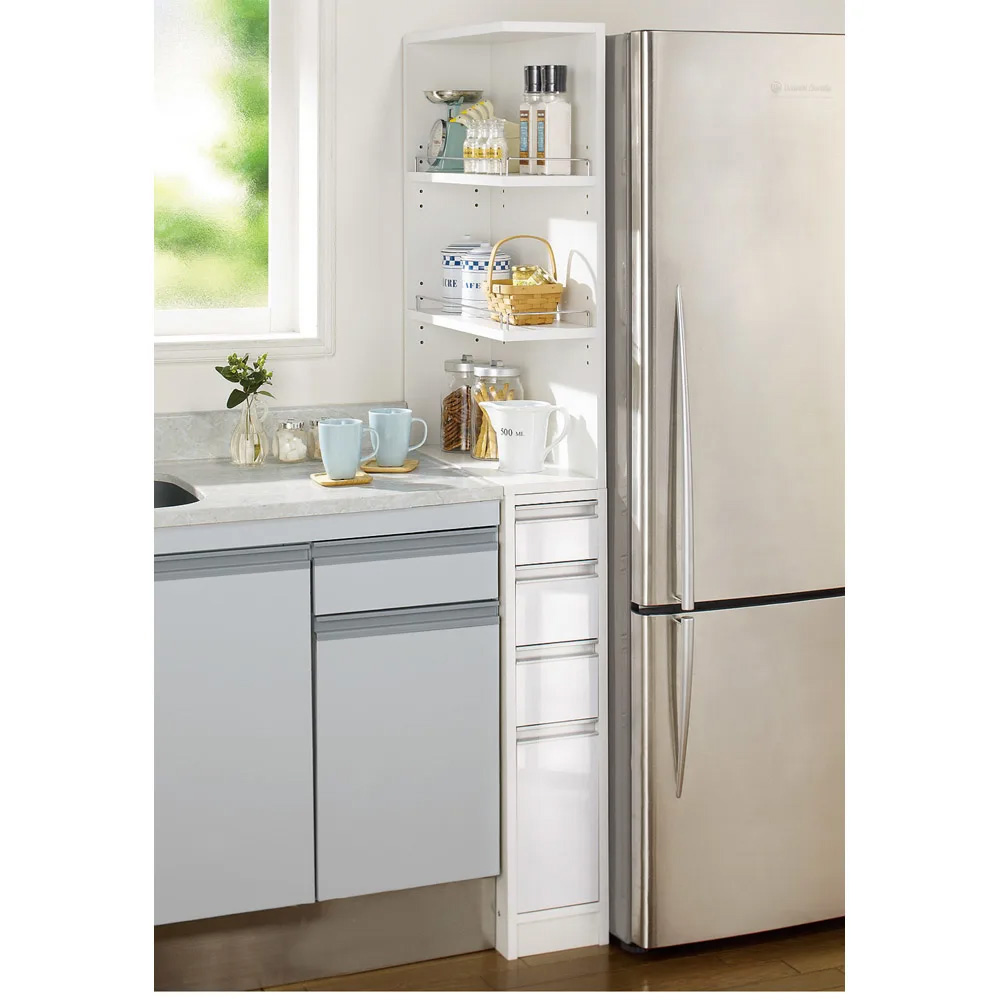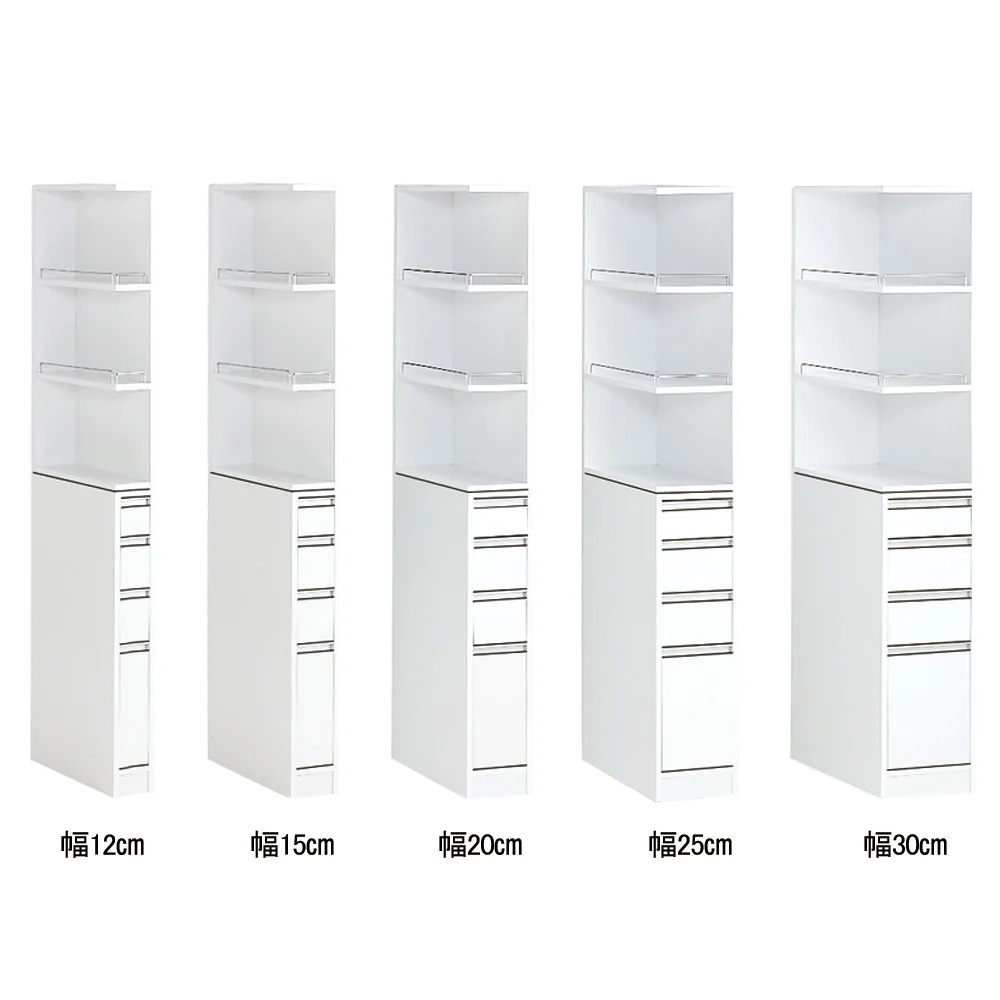 中身が見渡せて取り出しやすいオープンタイプの隙間収納。わずか幅12cm〜30cmのすき間に収納できるキッチン収納家具。上段は前からも横からもサッと取り出せる2面オープン棚で、収納棚板は3cmピッチで高さ調整が可能、引出しにはボトルも入る機能満載の隙間家具です。良く使う物を取りやすい場所に。動線がスムーズになる便利なキッチン収納庫◆たった12cmからの隙間がキッチンストッカーに変身します。◆サイドオープン部には調味料や使う事の多いキッチンツールを取り出しやすく。◆スパイスラック、調味料ラックとしてもご使用頂けます。◆棚板は3cmピッチ5段階でそれぞれ調節可能。落下防止のこぼれ止めバー付きです。◆オープン棚の向きは組立時に左右どちら向きにも設定可能です。◆前面は光沢感があり、汚れにくく、お手入れし易い素材で作りました。(ポリエステル化粧合板)◆側面も化粧仕上げだからお掃除もラクラクで清潔感をキープできます。◆たった12cmの隙間から、大量収納スペースにしてしまうアイデア満載のすきま収納です。◆収納棚板の高さはお好みに合わせて調整できるので収納物に合わせて調整可能です。◆小物類の収納に便利な引き出しが4杯付。再下段はボトルも入る高さ設定です。◆洗面所の隙間収納としてもお使い頂けます。隙間家具でも妥協したくないあなたに高機能を◆選べる幅と奥行きのサイズ展開であなたのキッチンにピッタリなサイズをお選び下さい。◆棚板には収納物が落ちないように落下防止バーが付いています。(最下段は除きます)◆もちろんオープン部の向きは左右どちらでも設定可能で置く場所を選びません。◆上下連結式なので棚と引き出しを左右に並べてキッチンカウンターとしてもお使い頂けます。◆清潔感のあるホワイトでおしゃれなシンプルモダンキッチンを演出します。◆洗面所の隙間収納としてもお使い頂けます。信頼と安心の国内工場での生産品です◆国内の職人がひとつずつ丁寧に仕上げた逸品です。◆細部の丁寧な仕上がりなど、国産品ならではの高品質をお楽しみください。◆キッチンのすきまを無駄なく使いたいあなたにお勧めのキッチン収納ラックです。新築やリフォーム、模様替えの時にもおすすめの逸品◆お引越しや模様替えのタイミングでスペースを便利に有効活用してみませんか?◆高価な備え付け家具やリフォームよりも、リーズナブルに新生活を始められます。◆是非普段使うものこそ、大好きなものをじっくりとご検討下さい。