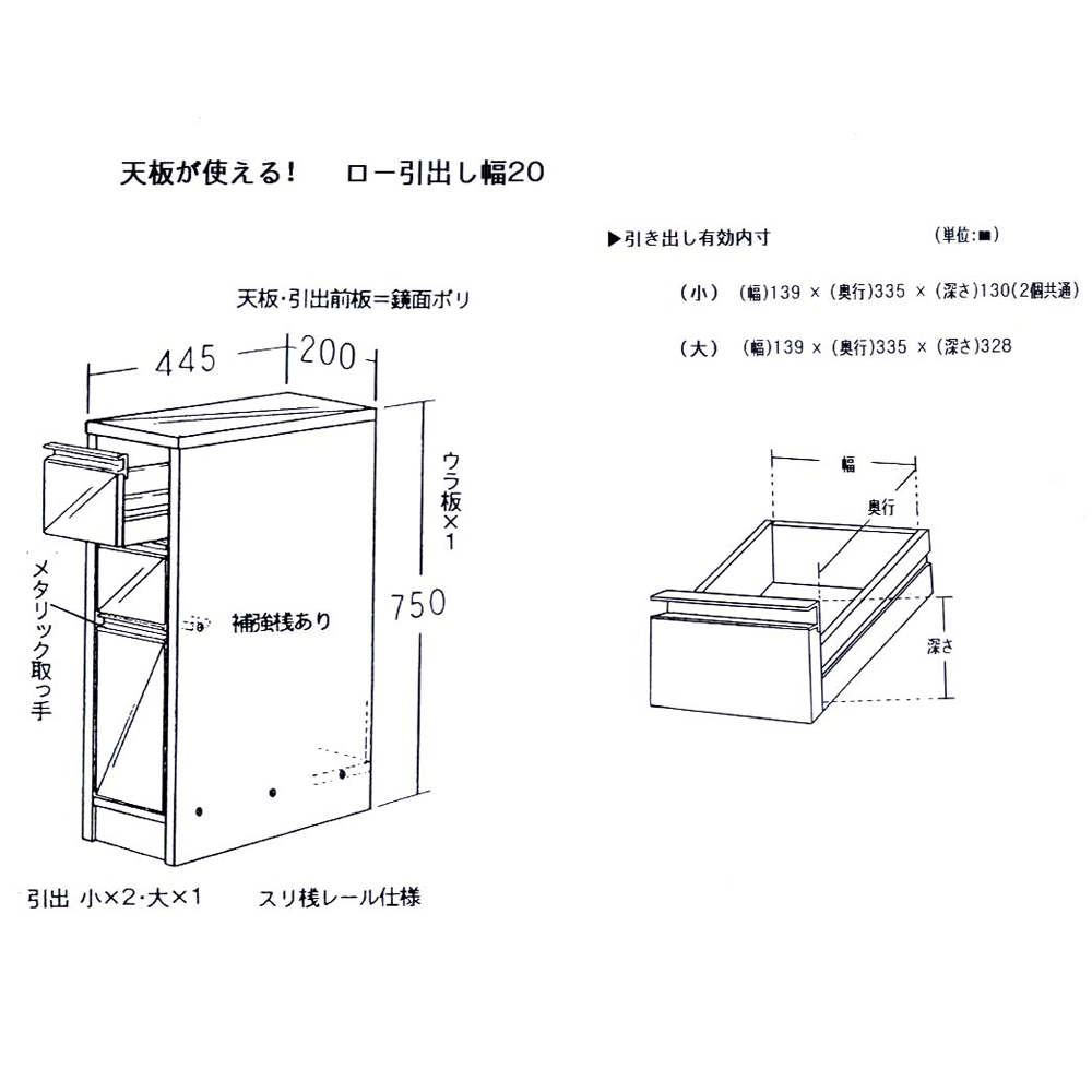 引出し底面化粧仕上げで、タオル類や下着類の収納にも嬉しいです。