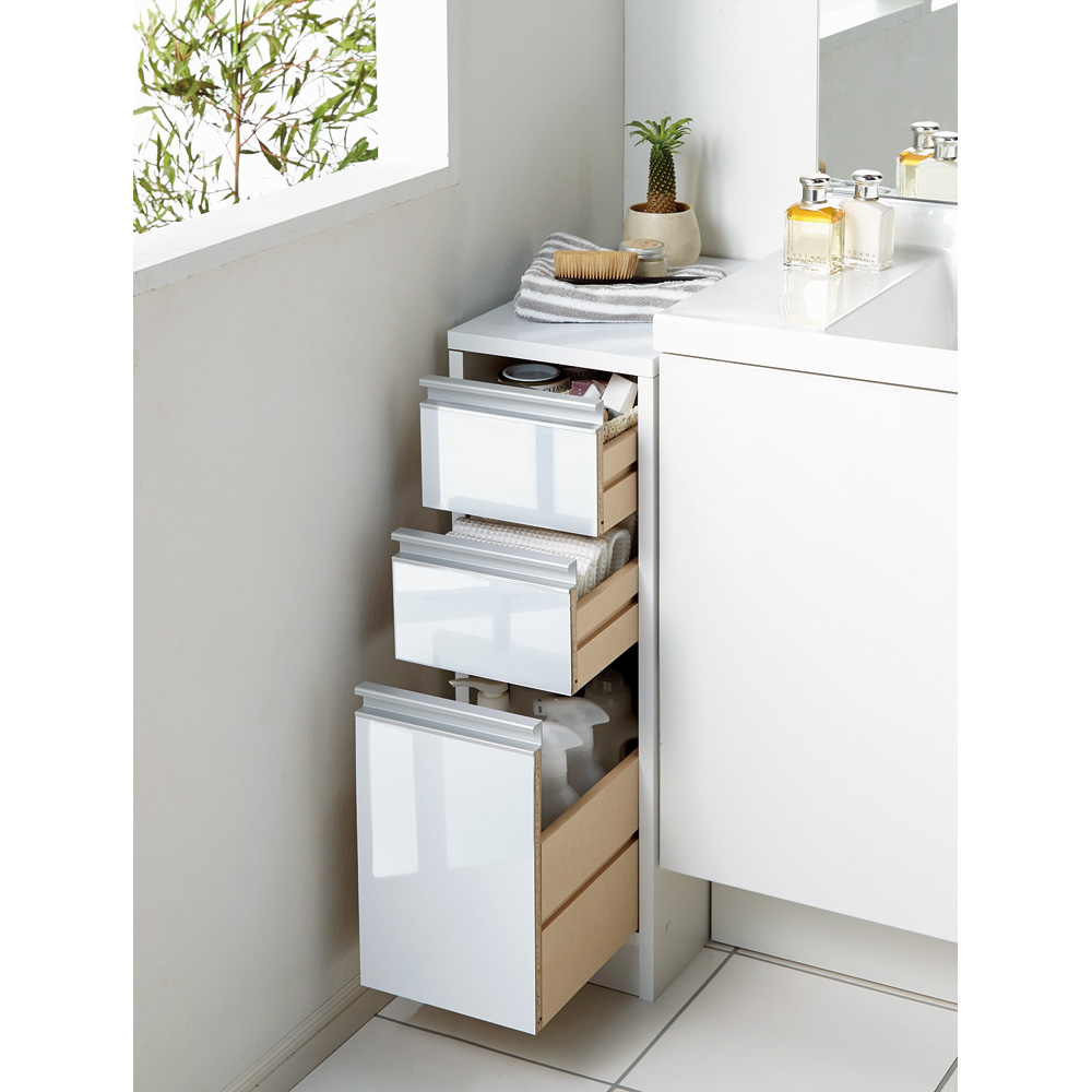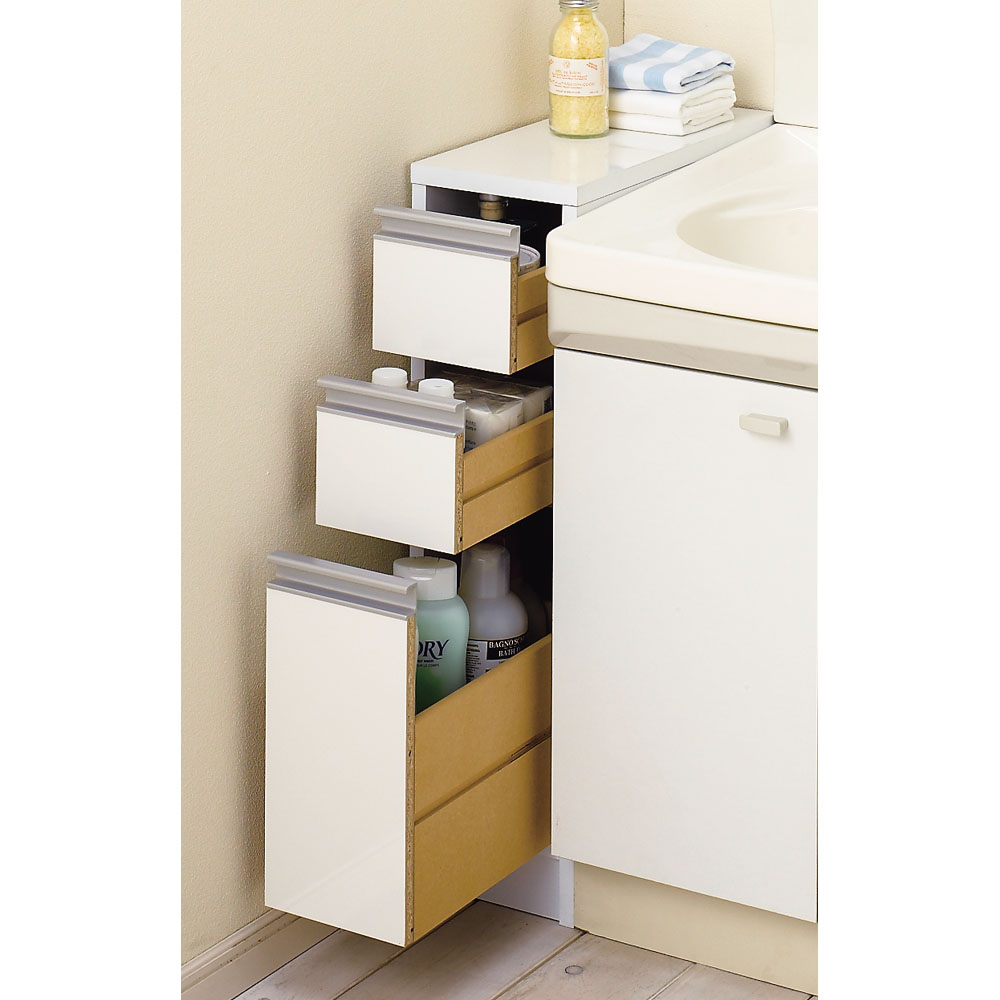 もう少しスペースが欲しい洗面台横に、高さがちょうどいいサニタリー収納。水ハネに強い中天板が洗面台の延長になるので置き場が増えて便利です。清潔感のある光沢仕上げのホワイト色です。幅15cm〜30cmの隙間を活用。洗面台横にぴったりのサニタリー隙間家具です●幅は15cm、20cm、25cm、30cmの4サイズからお選びいただけます。●洗面化粧台横に置けば洗面台の延長としてスペースが広がります。●洗面所収納にぴったりの光沢のあるホワイト色です。ポイント(1)水まわりでも気兼ねなく使えるポリエステル化粧合板を使用●天板と前面は美しくお掃除もラクなポリエステル化粧合板の光沢仕上げです。●洗面台の脇に置いて水がハネても問題なくお使いいただけます。●汚れたときもサッと拭き取れるお手入れ簡単の素材です。ポイント(2)引き出しには洗面所まわりのストック類やタオル収納に●洗剤や柔軟剤のストックに。タオル収納にも便利です。●引き出しの最下段は背の高いボトル類も収納できる深さがあります。