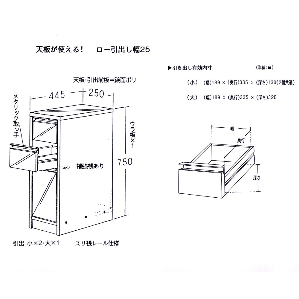 ・前面、天板は汚れてもお手入れがラクなポリエステル化粧合板 ・光沢仕上げで見た目もキレイな洗面所用すき間収納庫です。 ・最下段の深引き出しにはペットボトルも入る、引き出し高さ31.5センチ。 ※写真は幅20cmタイプです。