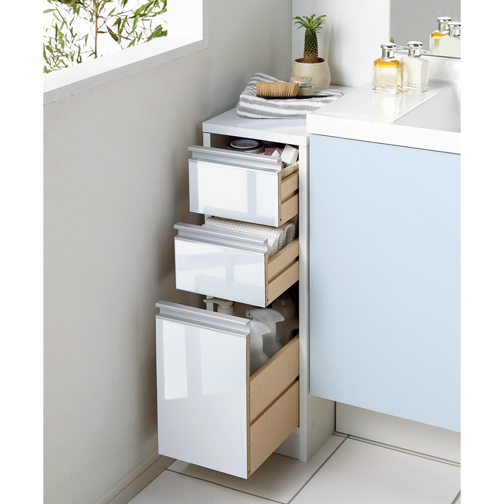 もう少しスペースが欲しい洗面台横に、高さがちょうどいいサニタリー収納。水ハネに強い中天板が洗面台の延長になるので置き場が増えて便利です。清潔感のある光沢仕上げのホワイト色です。幅15cm〜30cmの隙間を活用。洗面台横にぴったりのサニタリー隙間家具です●幅は15cm、20cm、25cm、30cmの4サイズからお選びいただけます。●洗面化粧台横に置けば洗面台の延長としてスペースが広がります。●洗面所収納にぴったりの光沢のあるホワイト色です。ポイント(1)水まわりでも気兼ねなく使えるポリエステル化粧合板を使用●天板と前面は美しくお掃除もラクなポリエステル化粧合板の光沢仕上げです。●洗面台の脇に置いて水がハネても問題なくお使いいただけます。●汚れたときもサッと拭き取れるお手入れ簡単の素材です。ポイント(2)引き出しには洗面所まわりのストック類やタオル収納に●洗剤や柔軟剤のストックに。タオル収納にも便利です。●引き出しの最下段は背の高いボトル類も収納できる深さがあります。