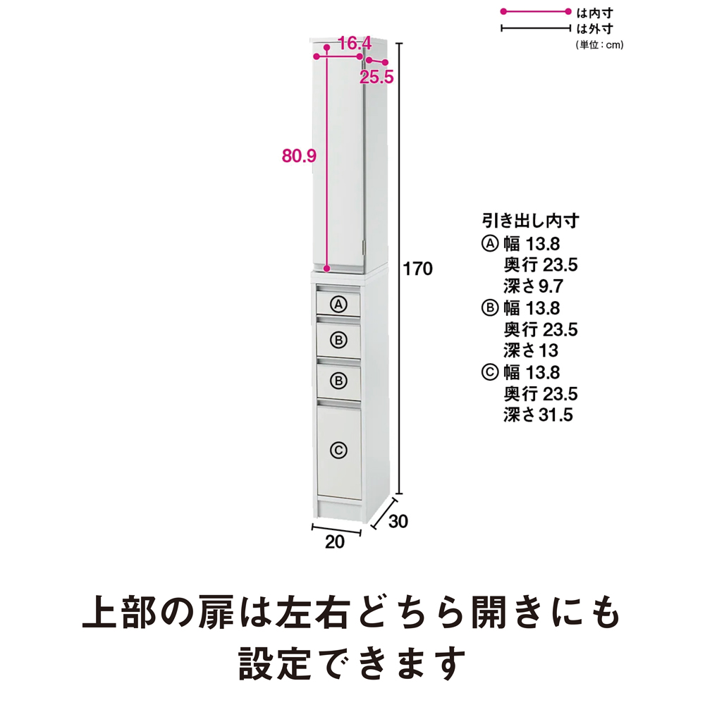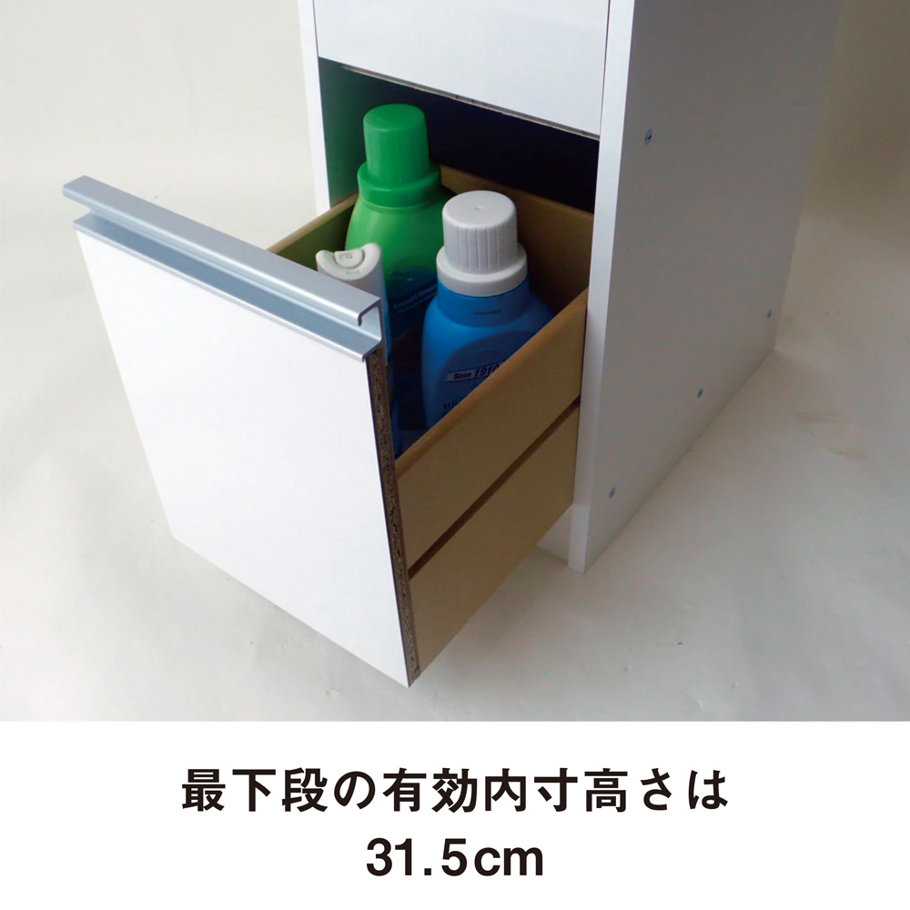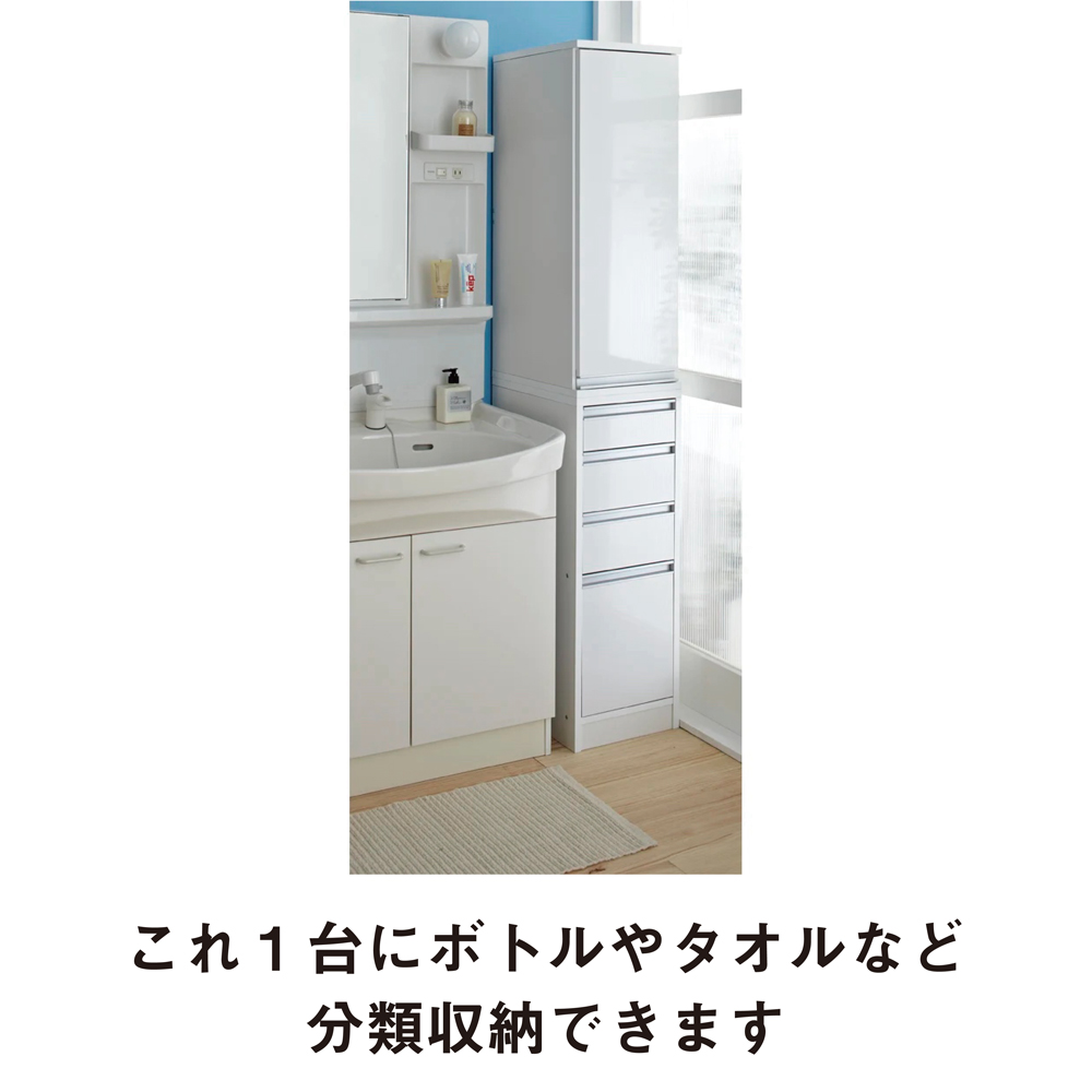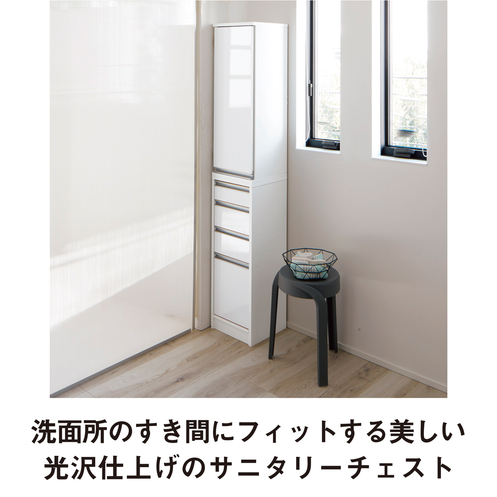 洗面所のすき間にフィットする、美しい光沢仕上げのランドリー・パウダールームチェスト。幅は15・20・25・30cmの4サイズのすき間収納家具。 奥行は30・45・55cmの3サイズの豊富なサイズ展開からお選びください。ご自宅の洗面所のすき間にフィットする豊富なサイズ展開です●幅15・20・25・30cm、奥行30・45・55cmの豊富なサイズからお選びいただけるすき間家具です。●洗面台と洗濯機のすき間や洗面台と壁面のすき間におすすめのスリム収納です。洗面所で安心して使える水ハネに強い素材を使用しました●前面は水ハネに強い光沢素材。美しいツヤ感で見た目と使いやすさにこだわりました。●側面は水ハネに強いハードコート紙を使用しています。収納物が隠せる扉と引き出しの使い勝手のよいダブル収納タイプです●上部の扉は左右どちら開きにも設定できます。●最下段の引き出しは深さがあり、背の高い洗剤や柔軟剤のボトル類も収納可能です。●上部の扉収納と下部の引き出し収納が同じ高さの85cmなので、横に並べてロータイプとしてもご使用いただけます。収納物に合わせて高さを変えられる可動棚3枚付き●奥行30cmタイプは扉内の棚の高さを6cm間隔で10段階に変えられるので、効率よく収納できます。安心の国内工場での生産品です●国内の工場でひとつずつ丁寧に仕上げた商品ですので安心してご使用いただけます。●洗面所や脱衣所の空間に収納を増やせる人気のディノスのすき間収納です。