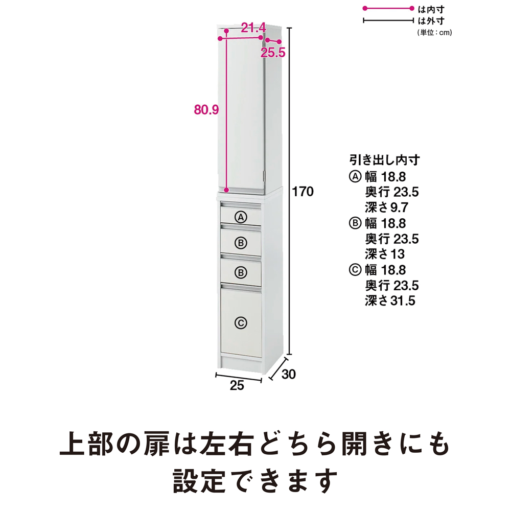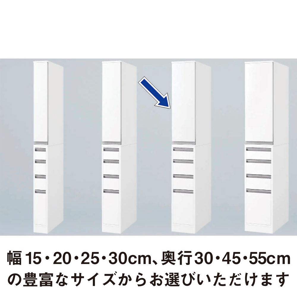 洗面所のすき間にフィットする、美しい光沢仕上げのランドリー・パウダールームチェスト。幅は15・20・25・30cmの4サイズのすき間収納家具。 奥行は30・45・55cmの3サイズの豊富なサイズ展開からお選びください。ご自宅の洗面所のすき間にフィットする豊富なサイズ展開です●幅15・20・25・30cm、奥行30・45・55cmの豊富なサイズからお選びいただけるすき間家具です。●洗面台と洗濯機のすき間や洗面台と壁面のすき間におすすめのスリム収納です。洗面所で安心して使える水ハネに強い素材を使用しました●前面は水ハネに強い光沢素材。美しいツヤ感で見た目と使いやすさにこだわりました。●側面は水ハネに強いハードコート紙を使用しています。収納物が隠せる扉と引き出しの使い勝手のよいダブル収納タイプです●上部の扉は左右どちら開きにも設定できます。●最下段の引き出しは深さがあり、背の高い洗剤や柔軟剤のボトル類も収納可能です。●上部の扉収納と下部の引き出し収納が同じ高さの85cmなので、横に並べてロータイプとしてもご使用いただけます。収納物に合わせて高さを変えられる可動棚3枚付き●奥行30cmタイプは扉内の棚の高さを6cm間隔で10段階に変えられるので、効率よく収納できます。安心の国内工場での生産品です●国内の工場でひとつずつ丁寧に仕上げた商品ですので安心してご使用いただけます。●洗面所や脱衣所の空間に収納を増やせる人気のディノスのすき間収納です。
