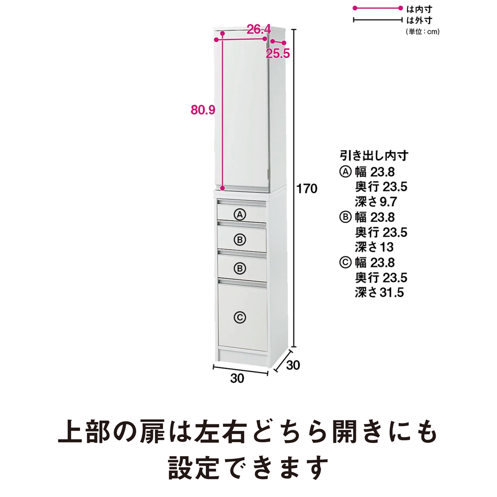 洗面所のすき間にフィットする、美しい光沢仕上げのランドリー・パウダールームチェスト。幅は15・20・25・30cmの4サイズのすき間収納家具。 奥行は30・45・55cmの3サイズの豊富なサイズ展開からお選びください。ご自宅の洗面所のすき間にフィットする豊富なサイズ展開です●幅15・20・25・30cm、奥行30・45・55cmの豊富なサイズからお選びいただけるすき間家具です。●洗面台と洗濯機のすき間や洗面台と壁面のすき間におすすめのスリム収納です。洗面所で安心して使える水ハネに強い素材を使用しました●前面は水ハネに強い光沢素材。美しいツヤ感で見た目と使いやすさにこだわりました。●側面は水ハネに強いハードコート紙を使用しています。収納物が隠せる扉と引き出しの使い勝手のよいダブル収納タイプです●上部の扉は左右どちら開きにも設定できます。●最下段の引き出しは深さがあり、背の高い洗剤や柔軟剤のボトル類も収納可能です。●上部の扉収納と下部の引き出し収納が同じ高さの85cmなので、横に並べてロータイプとしてもご使用いただけます。収納物に合わせて高さを変えられる可動棚3枚付き●奥行30cmタイプは扉内の棚の高さを6cm間隔で10段階に変えられるので、効率よく収納できます。安心の国内工場での生産品です●国内の工場でひとつずつ丁寧に仕上げた商品ですので安心してご使用いただけます。●洗面所や脱衣所の空間に収納を増やせる人気のディノスのすき間収納です。