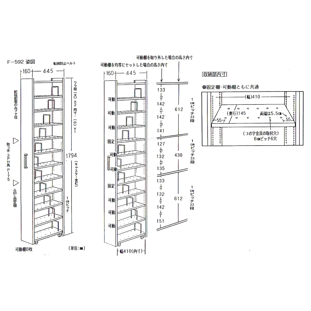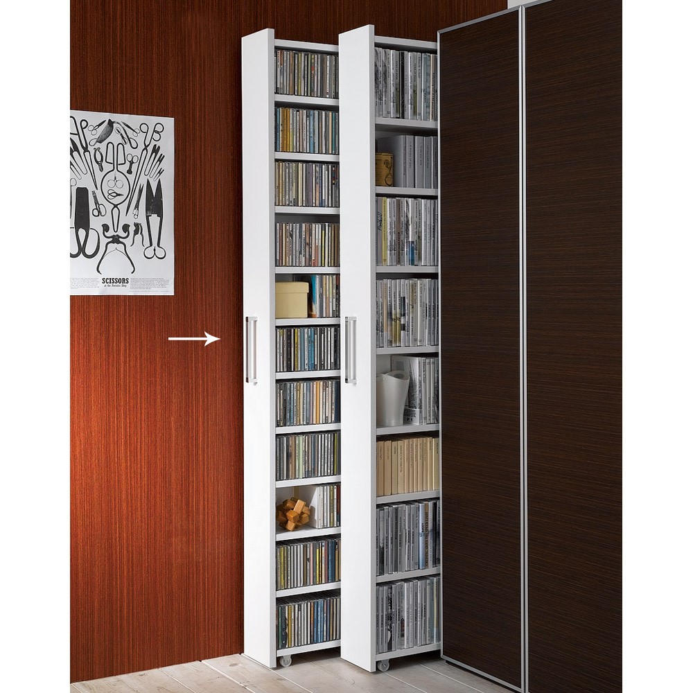 すき間を有効活用する、見やすく取り出しやすい国産の隙間スライド収納庫。1cmピッチの可動棚板で、CD・DVD・コミックなどをすっきりと大量収納できる、キャスター付き収納ラックシリーズです。多用途に使える隙間収納スリムなデザインと1cmピッチ可動棚板で、リビングやキッチン、SOHOの隙間を有効活用。あふれる本やAVソフトをすっきり収納し、省スペース設計でどんなシーンにも対応します。ロングセラーで人気のスライド式本棚は、日常のあらゆる収納ニーズに応えます。使い勝手の良さとおしゃれなデザインが魅力です。大量収納もおまかせ!頼れるすき間収納ラックCDラックやDVDラック、コミックラックとして使えるこのすき間収納ラックは、あふれるメディアや本を大量に収納可能。総耐荷重約55kgの耐久性があり、安心して多くの物を収納できます。スリム設計で限られたスペースを最大限に活用できる、おすすめの収納アイテムです。女性でもラクラク操作!取っ手とキャスター付きで快適収納取っ手と大型キャスター付きのこの収納ラックは、女性でも簡単に開閉できます。大量に収納しても軽い動きが特徴でスムーズに動かせます。アルミ製の引き出しやすいデザインの取っ手が魅力で、使い勝手が良く、お部屋をすっきり整頓できます。ブックエンド付き!しっかり固定で安心収納各段に付いているブックエンドが嬉しいポイント!本やアイテムをしっかり固定してくれるので、ずれ落ちる心配がありません。整理整頓がしやすく、安全に収納できるため、大切なコレクションも安心です。多用途に対応!可動棚板で無駄なく収納8枚の可動棚板が付属し、1cmピッチで高さ調節ができるこの収納ラック。CDなら約451枚、1段につき41枚を収納可能です。棚板を取り外せばDVDやコミックも収納できるため、多目的に利用でき、無駄なくスペースを活用できます。安全第一!転倒防止用具付きで心配無用安全に配慮して、転倒防止用具が付属しています。これにより、ラックの安定感が増し、安心して使用できます。日本製の高品質!選べるカラーと素材お部屋に合わせて選べるカラーは、ホワイト、ダークブラウン、ナチュラルの3色。化粧合板(ハードコート紙)を使用した本体に、アルミの取っ手がアクセント。デザイン性と機能性を兼ね備えた、信頼の一品です。※こちらの商品は、すきまCD収納ワゴン単体でのお届けになります。動作性が確認できる動画は、同シリーズ商品の「8段2列セット(DVD&コミック用)」です。
