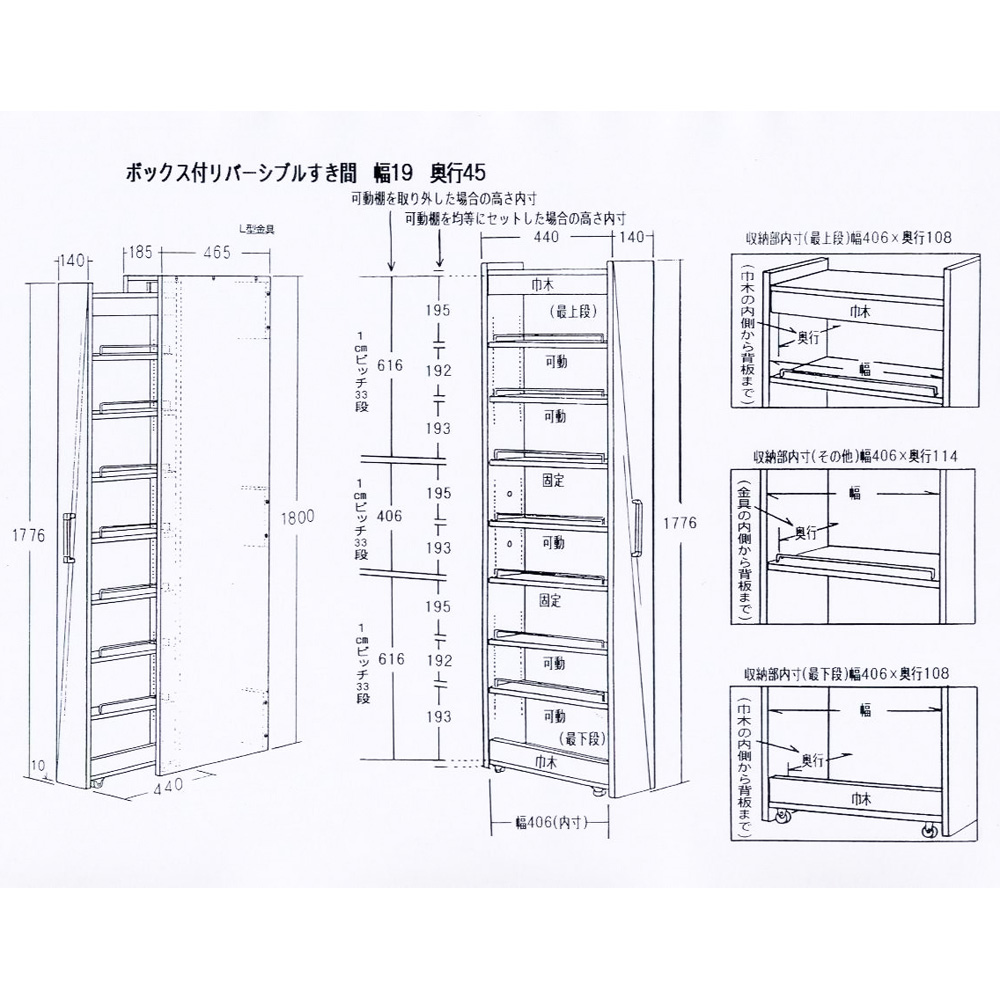 ボックスでキッチンや洗面所のすき間を目隠し&ホコリを防いで清潔。組立時にホワイトかシルバーの前面カラーが選べるリバーシブルタイプ。棚板は1cmピッチで収納物に合わせて。幅20cm以下でも収納できる隙間家具。目隠ししながらホコリを防いでスマートに収納力アップ◆たった15cmからの隙間がキッチンストッカーに変身します。◆多くのお客様にご好評を頂いているディノスの人気のキッチン収納のアイデア商品です。◆前面は光沢感があり、汚れにくく、お手入れし易いポリエステル化粧合板素材で作りました。◆ワゴンをボックスに仕舞えば目隠しでスッキリ。すき間を利用して収納上手にさせるキッチン収納です。◆すっきり隠せてホコリを防ぐボックスタイプは急な来客にも安心です。◆収納棚板の高さはお好みに合わせて1cm間隔で調整できるので収納物に合わせて調整可能です。隙間家具でも妥協したくないあなたに高機能を◆選べる幅と奥行きのサイズ展開であなたのキッチンにピッタリなサイズをお選び下さい。◆前面(取っ手のある部分)はホワイト・シルバーのどちらにも設定可能。◆棚板には収納物が落ちないように落下防止バーが付いています。(最下段は除きます)◆ワゴンにはキャスターが付いているので開け閉めが簡単になっています。◆もちろんオープン部の向きは左右どちらでも設定可能で置く場所を選びません。◆清潔感のあるホワイトでおしゃれなシンプルモダンキッチンを演出します。信頼と安心の国内工場での生産品です◆国内の職人がひとつずつ丁寧に仕上げた逸品です。◆細部の丁寧な仕上がりなど、国産品ならではの高品質をお楽しみください。◆キッチンのすきまを無駄なく使いたいあなたにお勧めのキッチン収納ラックです。新築やリフォーム、模様替えの時にもおすすめの逸品◆お引越しや模様替えのタイミングでスペースを便利に有効活用してみませんか?◆高価な備え付け家具やリフォームよりも、リーズナブルに新生活を始められます。◆是非普段使うものこそ、大好きなものをじっくりとご検討下さい。