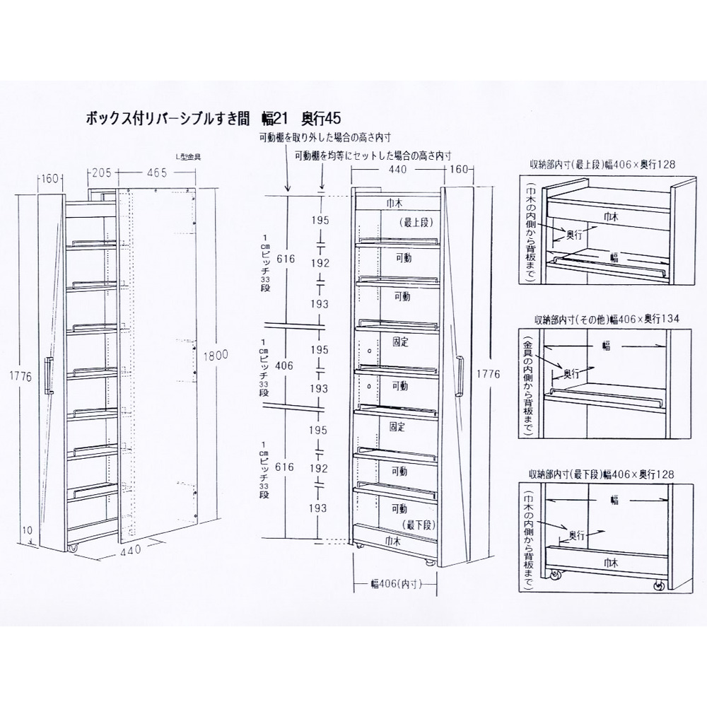 ボックスでキッチンや洗面所のすき間を目隠し&ホコリを防いで清潔。組立時にホワイトかシルバーの前面カラーが選べるリバーシブルタイプ。棚板は1cmピッチで収納物に合わせて。幅25cm以下でも収納できる隙間家具。目隠ししながらホコリを防いでスマートに収納力アップ◆たった15cmからの隙間がキッチンストッカーに変身します。◆多くのお客様にご好評を頂いているディノスの人気のキッチン収納のアイデア商品です。◆前面は光沢感があり、汚れにくく、お手入れし易いポリエステル化粧合板素材で作りました。◆ワゴンをボックスに仕舞えば目隠しでスッキリ。すき間を利用して収納上手にさせるキッチン収納です。◆すっきり隠せてホコリを防ぐボックスタイプは急な来客にも安心です。◆収納棚板の高さはお好みに合わせて1cm間隔で調整できるので収納物に合わせて調整可能です。隙間家具でも妥協したくないあなたに高機能を◆選べる幅と奥行きのサイズ展開であなたのキッチンにピッタリなサイズをお選び下さい。◆前面(取っ手のある部分)はホワイト・シルバーのどちらにも設定可能。◆棚板には収納物が落ちないように落下防止バーが付いています。(最下段は除きます)◆ワゴンにはキャスターが付いているので開け閉めが簡単になっています。◆もちろんオープン部の向きは左右どちらでも設定可能で置く場所を選びません。◆清潔感のあるホワイトでおしゃれなシンプルモダンキッチンを演出します。信頼と安心の国内工場での生産品です◆国内の職人がひとつずつ丁寧に仕上げた逸品です。◆細部の丁寧な仕上がりなど、国産品ならではの高品質をお楽しみください。◆キッチンのすきまを無駄なく使いたいあなたにお勧めのキッチン収納ラックです。新築やリフォーム、模様替えの時にもおすすめの逸品◆お引越しや模様替えのタイミングでスペースを便利に有効活用してみませんか?◆高価な備え付け家具やリフォームよりも、リーズナブルに新生活を始められます。◆是非普段使うものこそ、大好きなものをじっくりとご検討下さい。