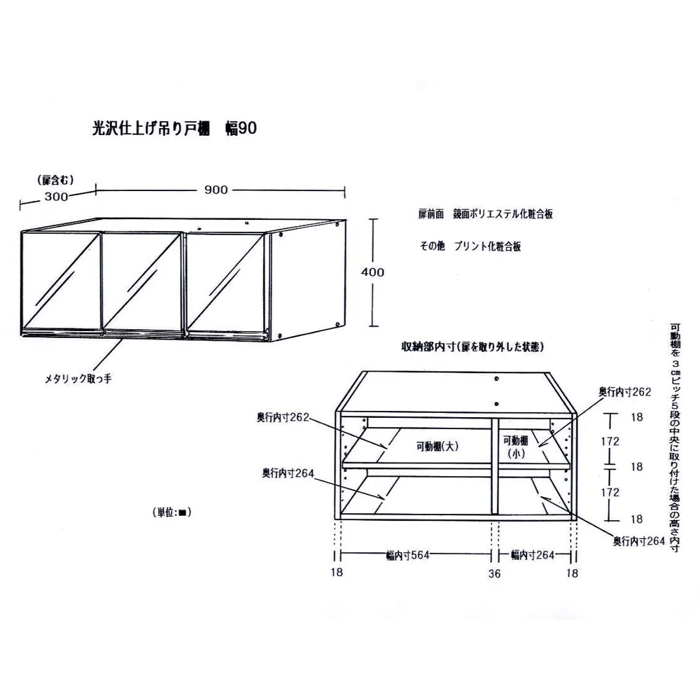 吊り戸棚を使って狭いスペースでも効率的な収納ができます。 前面は光沢仕上げで高級感があります。
