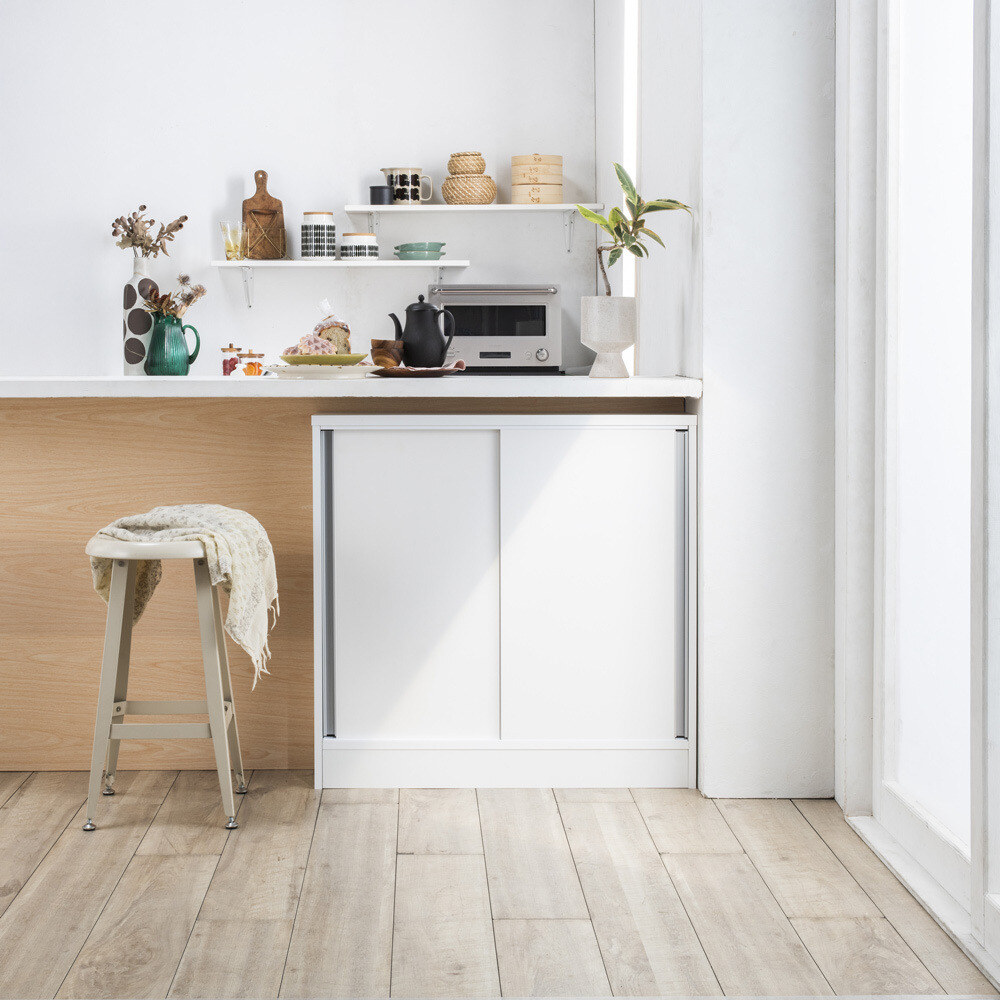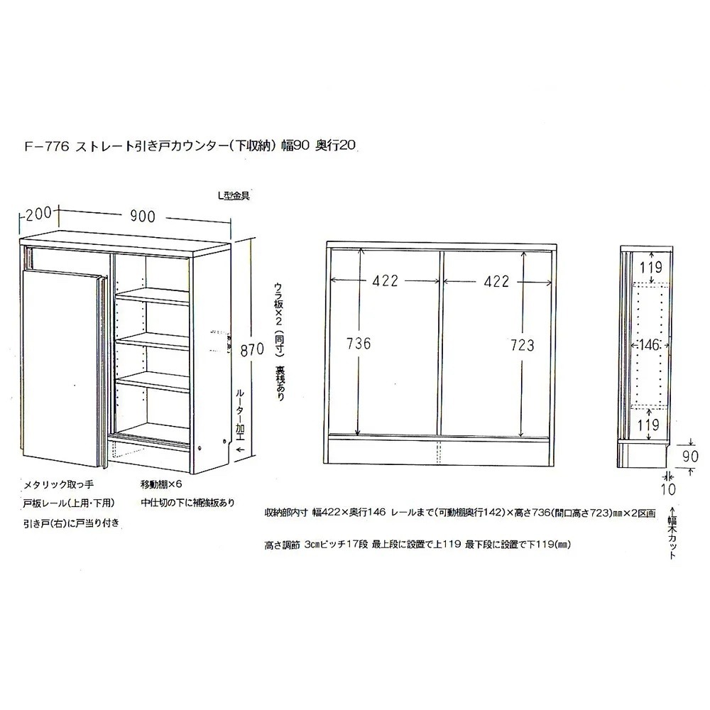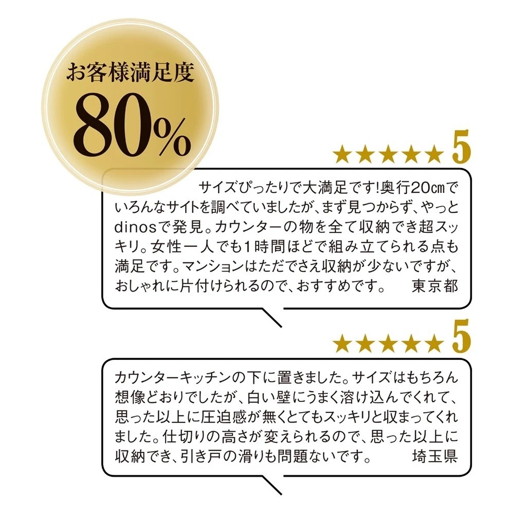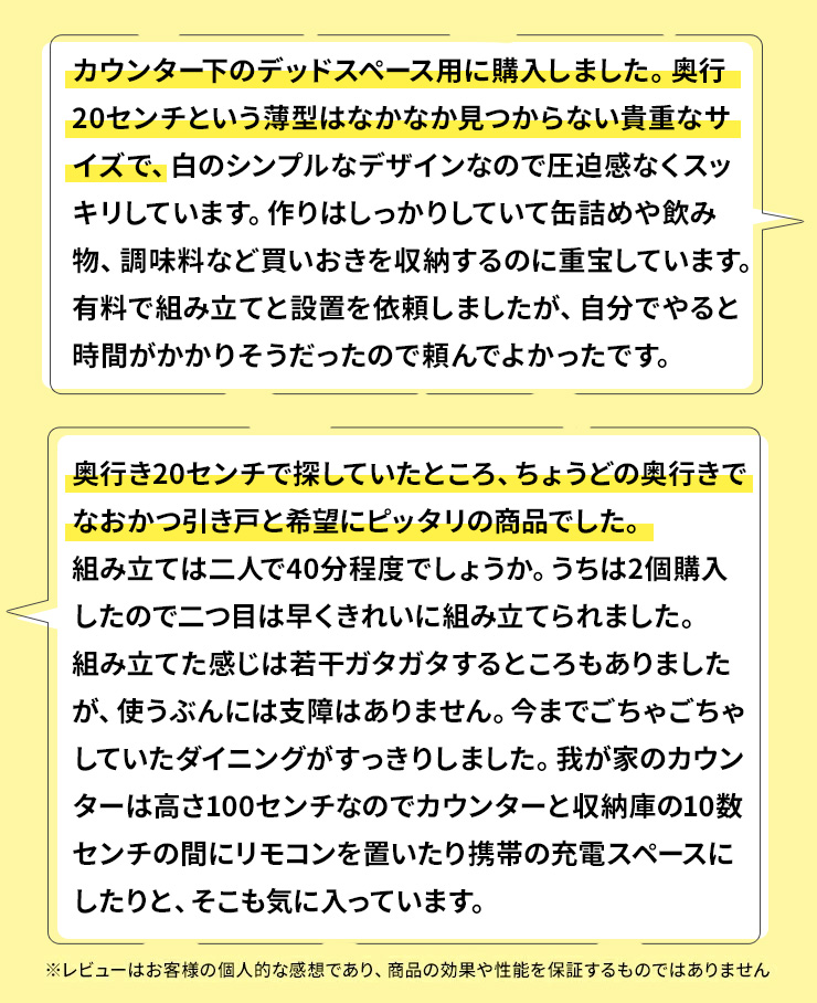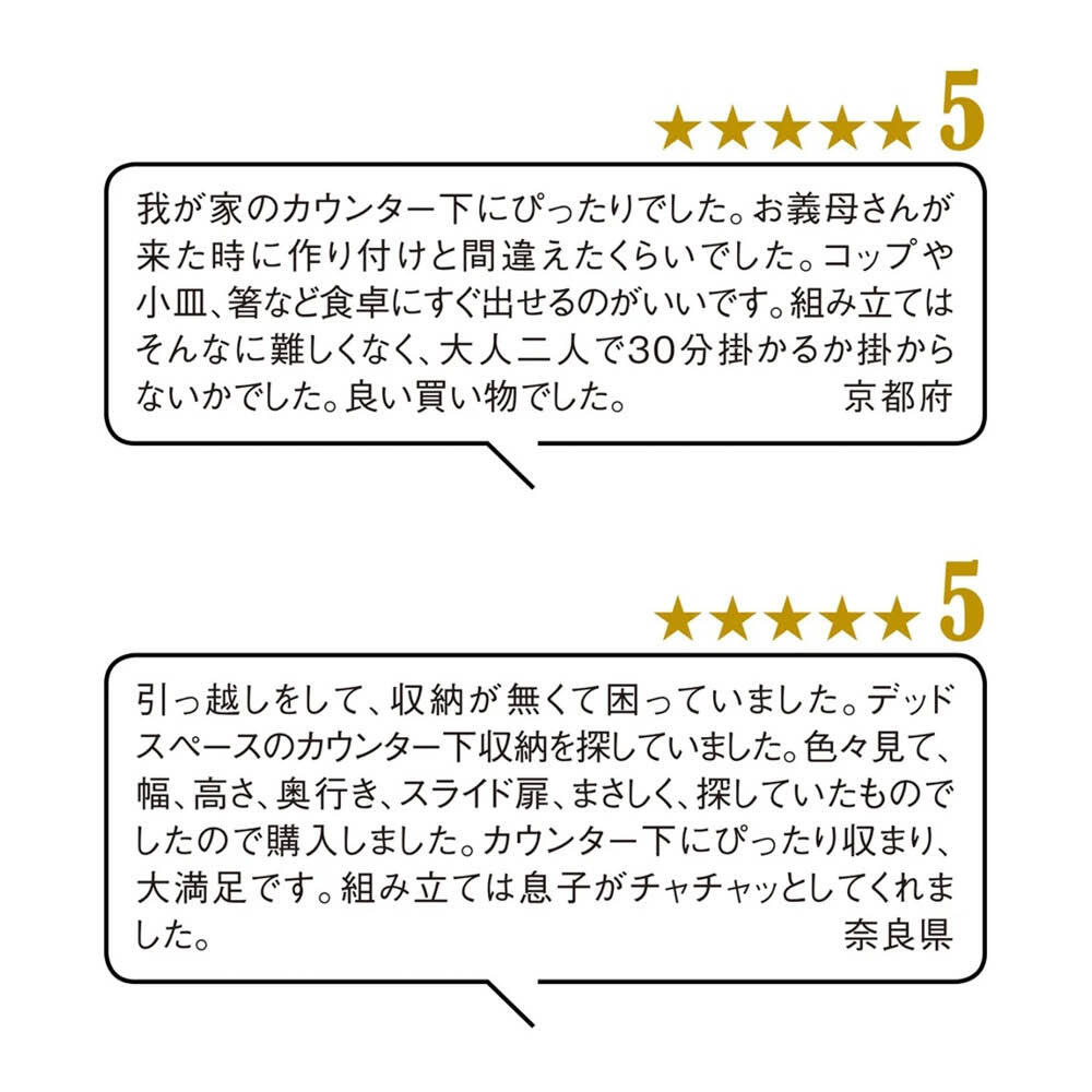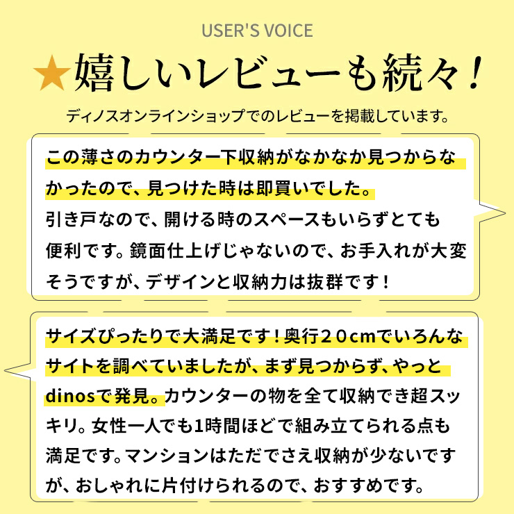奥行20cmタイプは薄型で、狭いカウンター天板の下でもすっきり収まりやすいサイズです。 ※写真は別売りの引き出しタイプです。