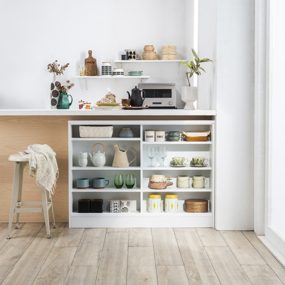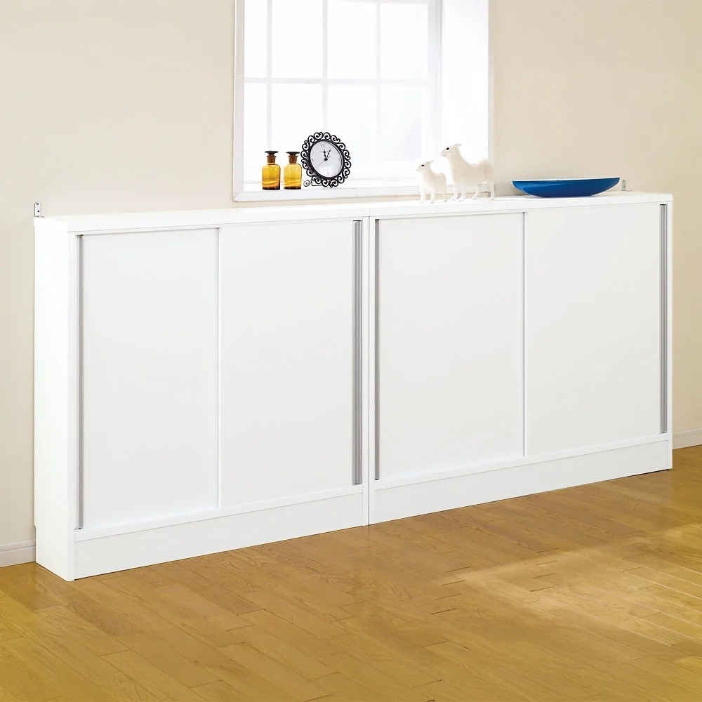 シンプルなデザインで窓下収納としても◎ ※転倒防止金具付きです。 ※写真は幅90cm奥行20cmタイプ、幅120cm奥行20cmタイプの組合せ例。