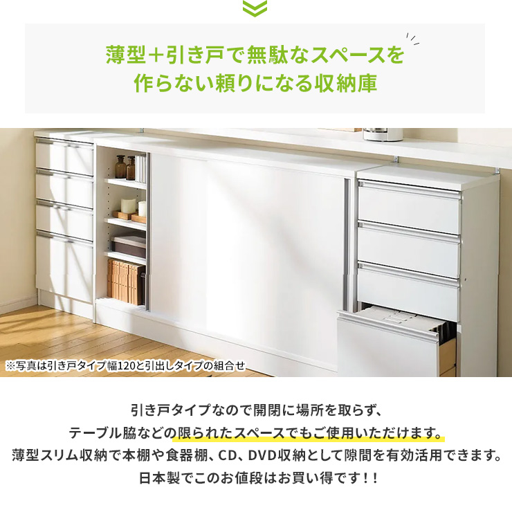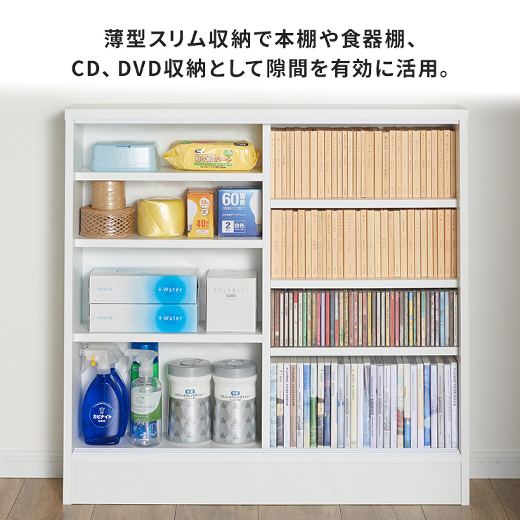 お客様満足度80%以上の高評価!薄型+引き戸で無駄なスペースを作らない頼りになる収納庫。奥行20cmと30cmが選べます。引き戸タイプなので開閉に場所を取らず、薄型スリム収納で本棚や食器棚、CD、DVD収納として隙間を有効に活用。薄型+引き戸で無駄なスペースを作らない頼りになる収納庫奥行20cmと30cmが選べる薄型の収納庫です。引き戸タイプなので開閉に場所を取らず、テーブル脇などの限られたスペースでもご使用いただけます。 薄型スリム収納で本棚や食器棚、CD、DVD収納として隙間を有効活用できます。日本製でこのお値段はお買い得です!!◎テーブルを脇に置いても出し入れしやすい引き戸タイプ。◎奥行1cm高さ9cmの幅木カット仕様。※可動収納棚板6枚付き。棚板奥行(有効)内寸:14(14.5)cmです。〜安心と信頼の国内生産品〜◎熟練の家具職人がひとつずつ丁寧に仕上げたキッチン収納・本棚(書棚)です。◎細部の丁寧な仕上がりなど、国産品ならではの高品質をお楽しみください。