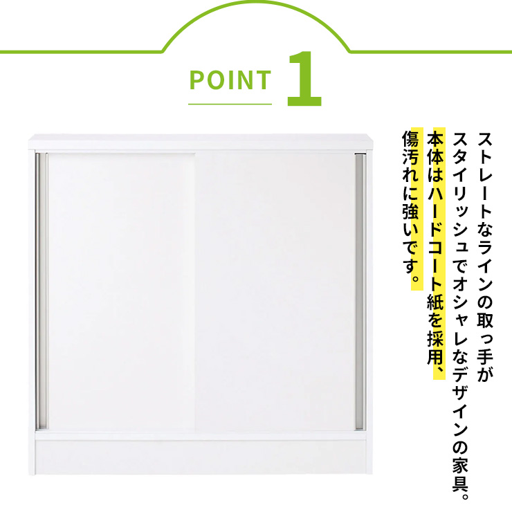 ストレートなラインの取っ手がスタイリッシュでオシャレなデザインの家具。 本体はハードコート紙を採用、傷汚れに強いです。