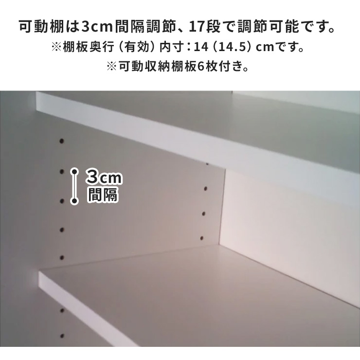 可動棚は3cm間隔調節、17段で調節可能。 ※棚板奥行 有効内寸約14.5cm