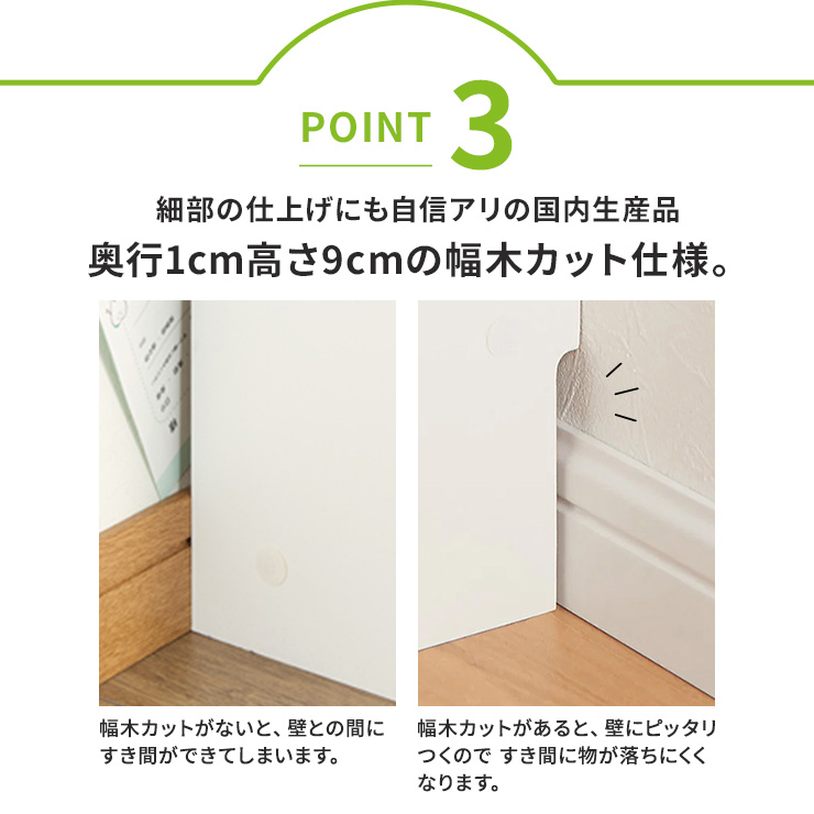 幅木カット(9×1cm)付で壁にぴったり設置可能です。