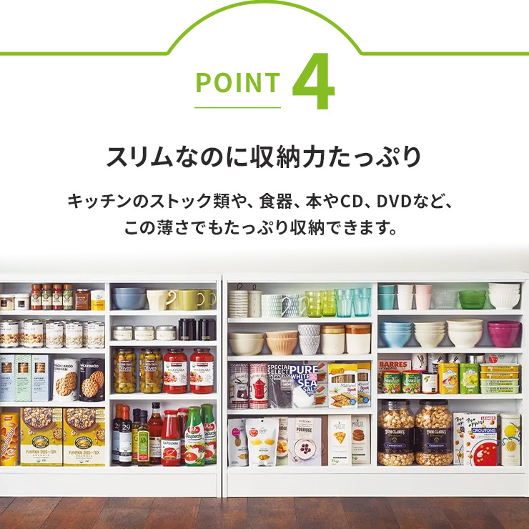 スリムなのに収納力たっぷり!キッチンのストック類や、食器、本やCD、DVDなど、この薄さでもたっぷりと収納できます。可動棚板は3cm間隔で、17段階で調節できます。※奥行20cm(奥行内寸14.2cm)