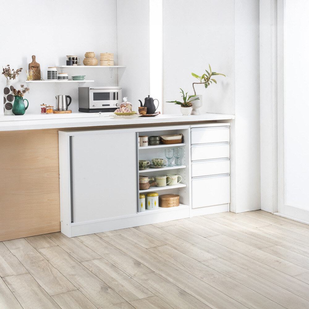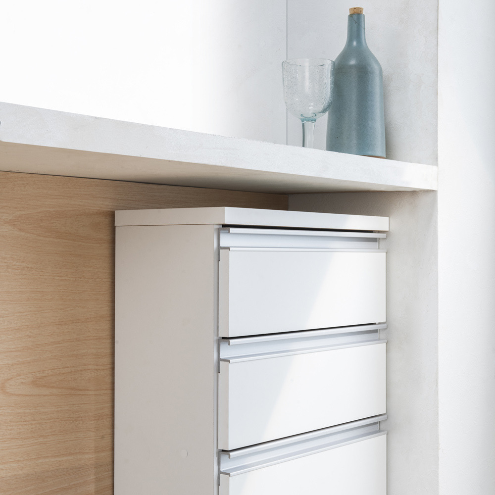 ストレートなラインの取っ手がスタイリッシュでオシャレなデザインの家具。 本体はハードコート紙を採用、傷汚れに強いです。