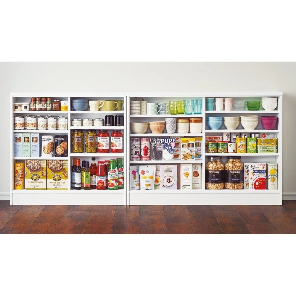 スリムなのに収納力たっぷり!キッチンのストック類や、食器、本やCD、DVDなど、この薄さでもたっぷりと収納できます。可動棚板は3cm間隔で、17段階で調節できます。※奥行20cm(奥行内寸14.2cm)