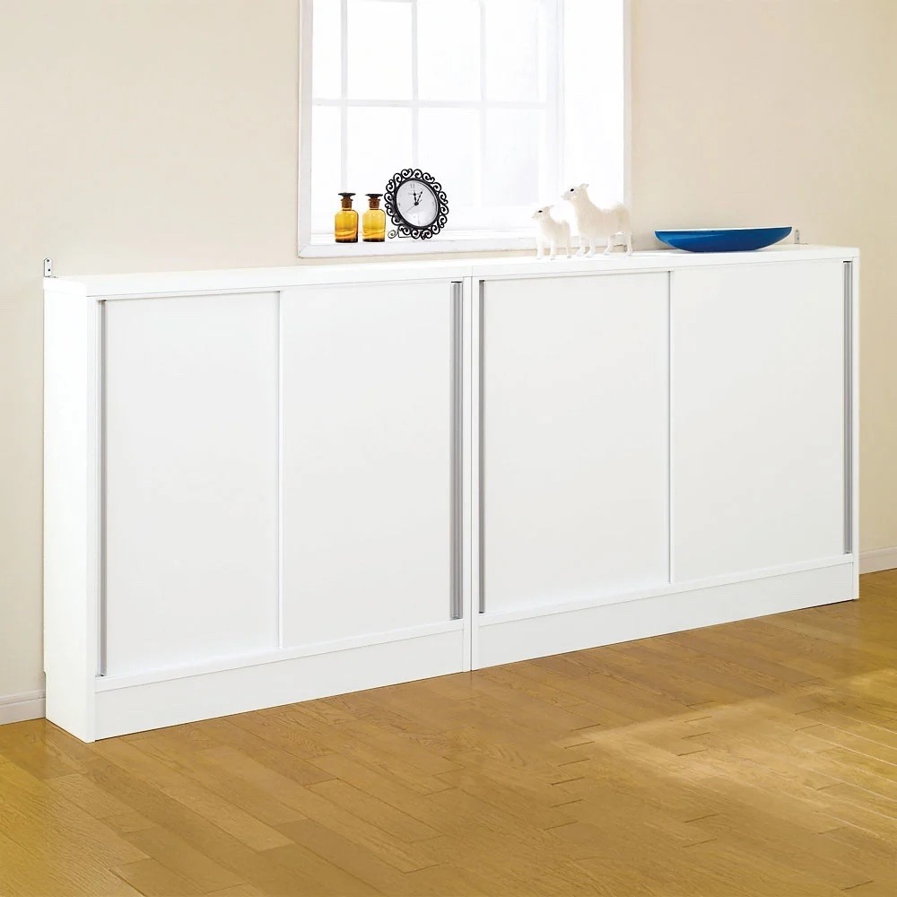 シンプルなデザインで窓下収納としても◎ ※転倒防止金具付きです。 ※写真は幅90cm奥行20cmタイプ、幅120cm奥行20cmタイプの組合せ例。