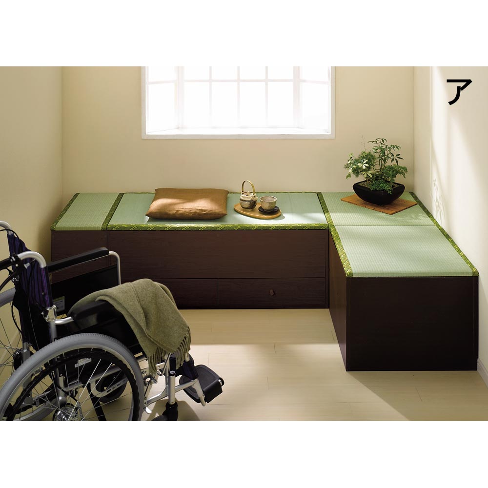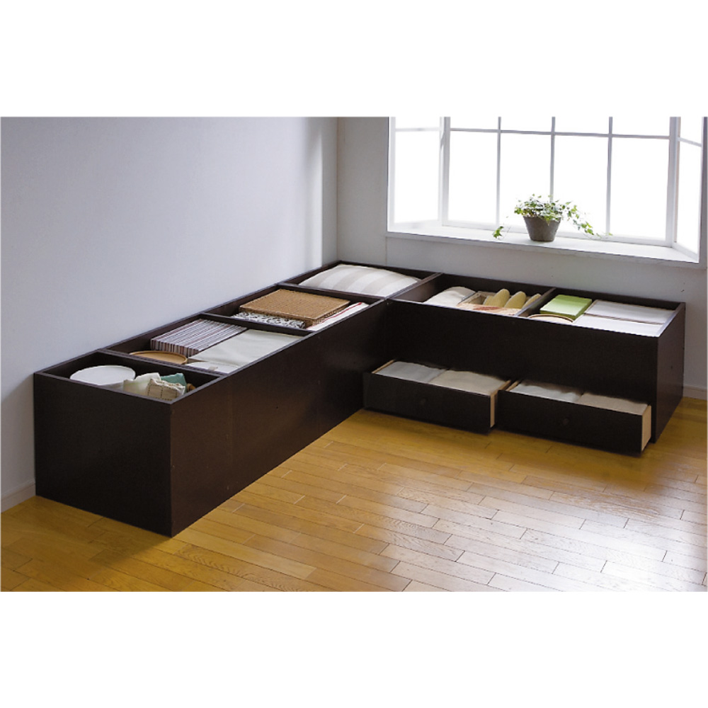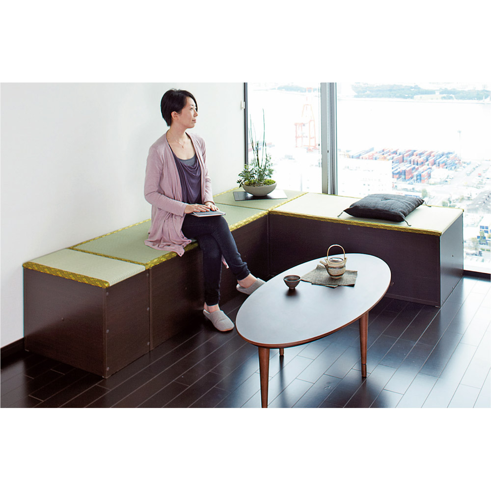 ※写真は高さ45cmタイプになります。 【左からミニ・半畳・1畳・1畳引出し付きの組み合わせ】高さ45cmはベンチとしても使用できます。写真はコーナー使用例。