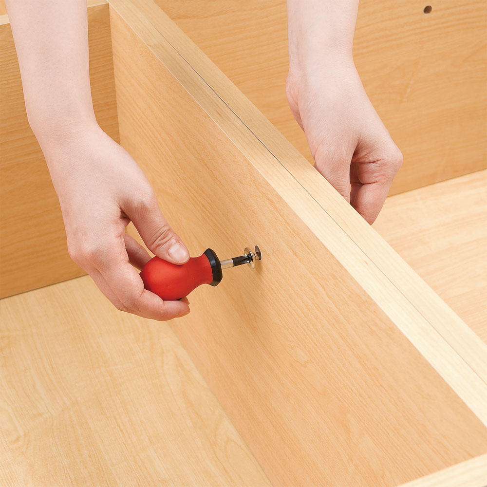 側板にある連結穴はキャップ、ネジ頭はシールで隠すことができます。