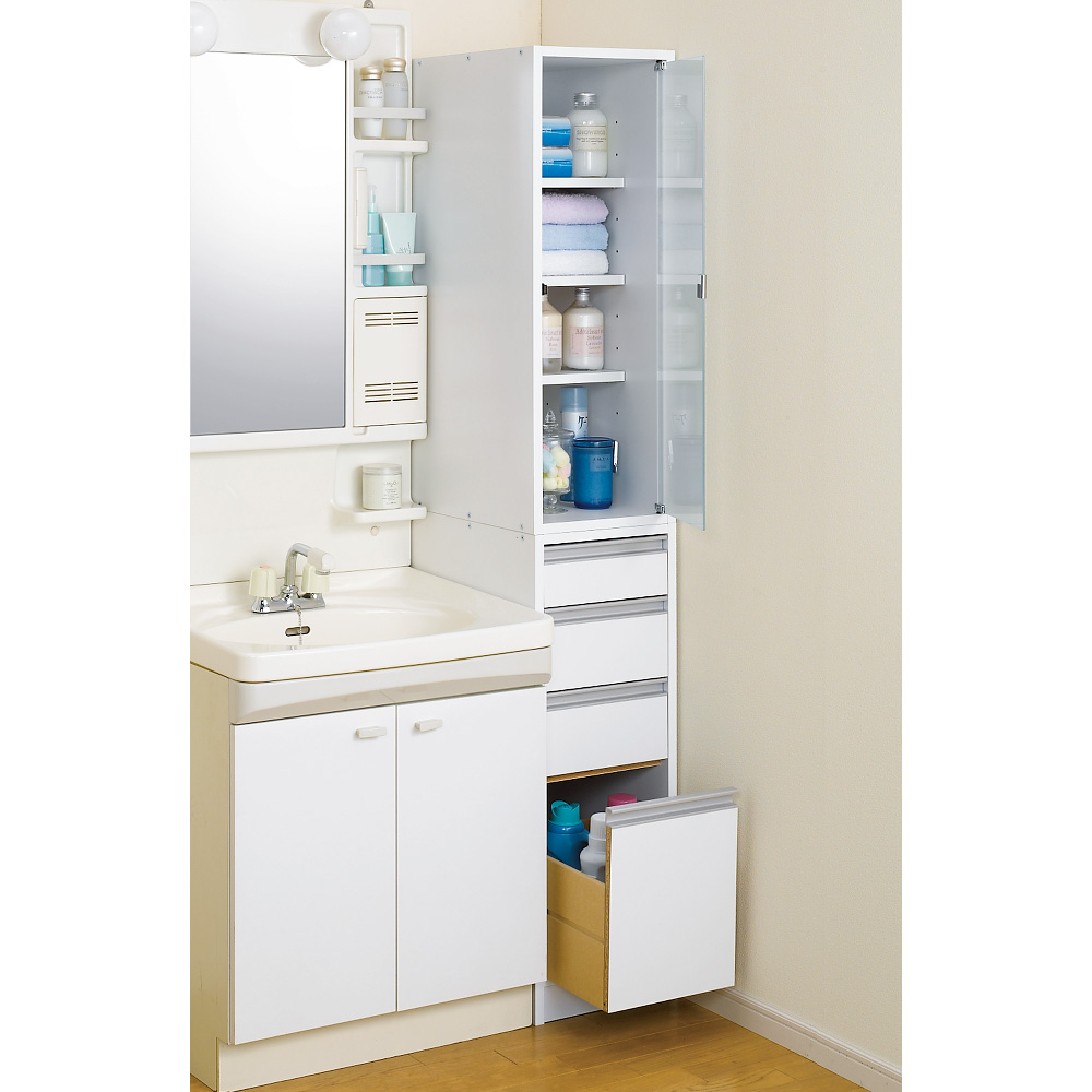 透明感が美しいアクリル扉を使用した隙間収納家具です。チェストの前面は光沢感のあるホワイトで清潔感もアップします。幅15cmからのサイズ展開で狭い洗面所でも収納を増やせます。