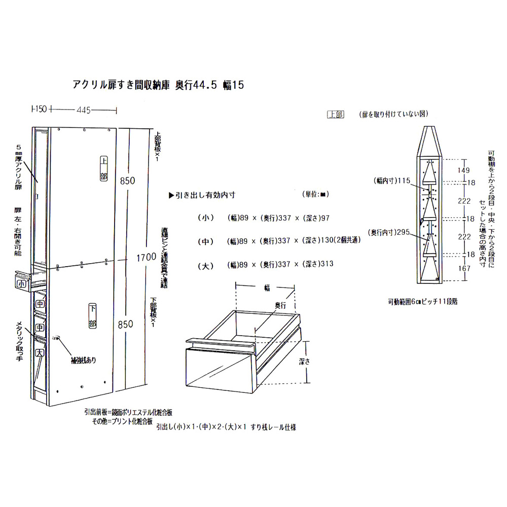 アクリル扉すき間収納庫 奥行44.5・幅15cm 洗面所収納 隙間収納 トイレ 洗面所 ランドリー収納 526645