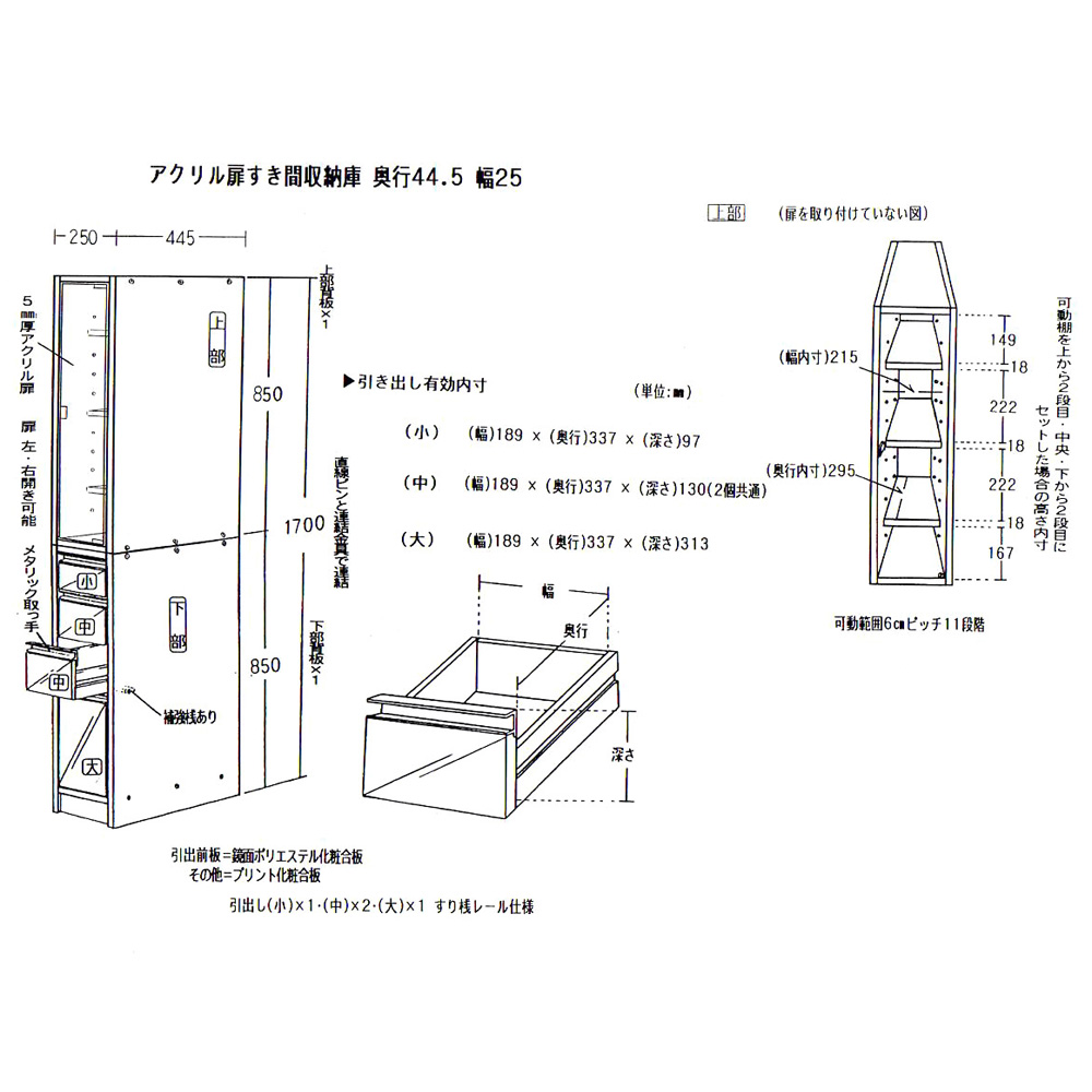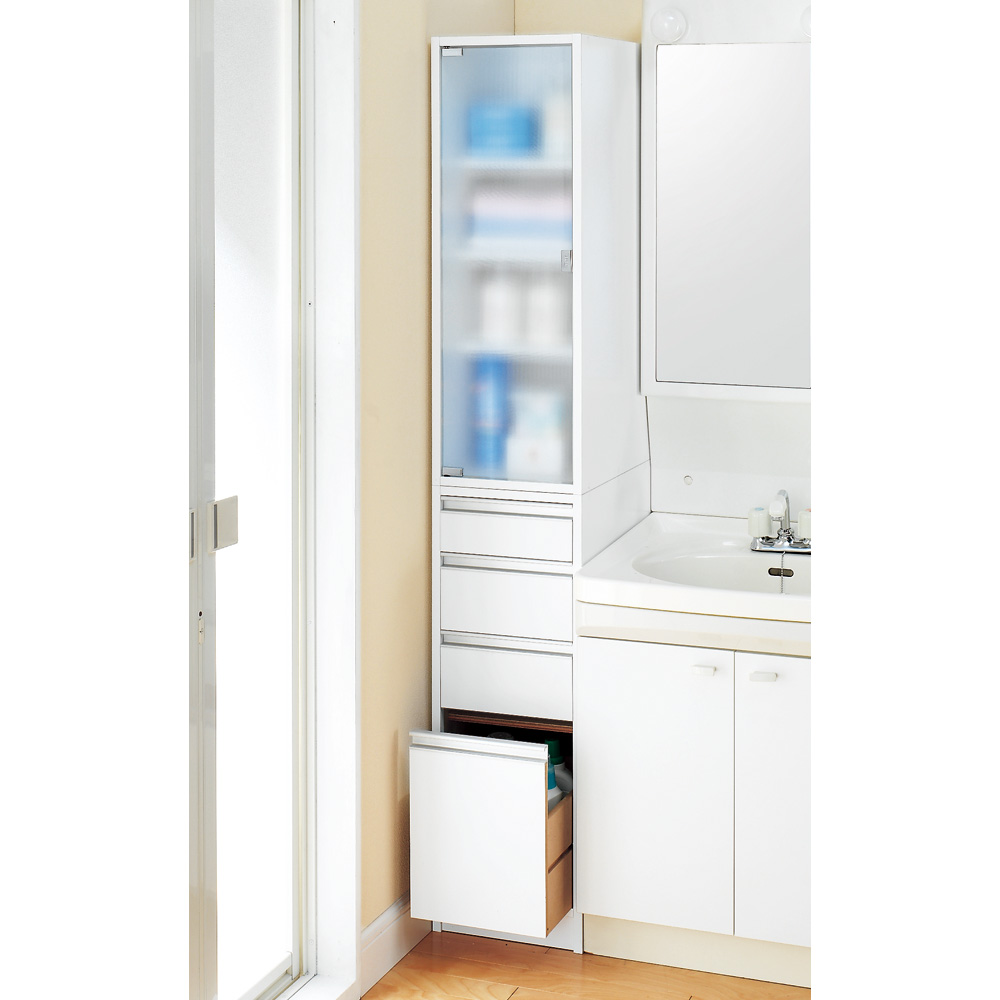 透明感が美しいアクリル扉を使用した隙間収納家具です。チェストの前面は光沢感のあるホワイトで清潔感もアップします。幅15cmからのサイズ展開で狭い洗面所でも収納を増やせます。洗面所収納にはインテリア性のある隙間家具を●アクリルの扉が清潔感を感じさせるロングセラーのサニタリー収納です。●幅15cm、20cm、25cm、30cmの4サイズをご用意しております。●奥行は薄型収納の29.5cm、洗面台横にぴったりの44.5cmの2サイズです。●狭い洗面所で収納力アップさせるアイデア収納です。●天板が化粧仕上げなので上部とチェスト部は横に並べてロータイプとしても使えます。ポイント(1)アクリル扉の透明感がサニタリースペースを上品な雰囲気に●うっすらと品よく隠せるアクリル素材の扉を使用しています。●収納物の場所もわかるので取り出しやすさもアップします。●白基調のデザインなので、とてもスッキリした印象です。●アクリル扉は左右どちら開きにも設定が可能です。●扉内の棚板は収納物の高さに合わせて6cmピッチで高さ調整ができます。ポイント(2)チェストには洗面所周りの小物やタオル収納に●すき間を活用できるので、洗面所チェストやランドリーラックをお考えの方にもおすすめです。●引き出しの中には詰め替え用の洗剤や柔軟剤、化粧品やコンタクトなどを。●最下段の引き出しは31.5cmの深さがあるので背の高い柔軟剤も入ります。ポイント(3)水回りで使うことを考えた素材で作っています●アクリルの扉は湿気に強く、洗面所や脱衣所でも気兼ねなく使えます。●チェスト前面には「ポリエステル化粧合板」を採用。水ハネや汚れも簡単に落とせます。