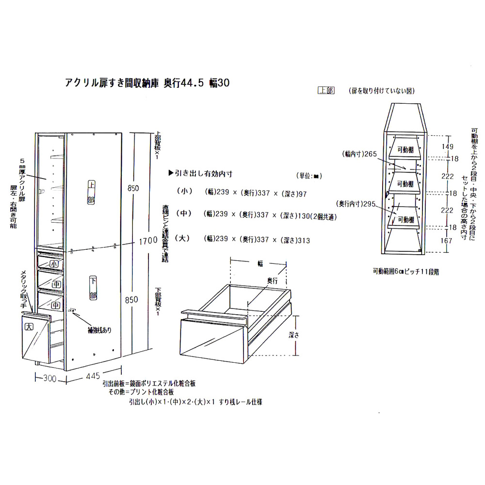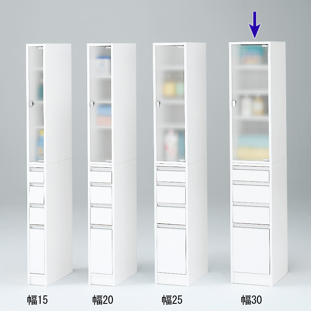 透明感が美しいアクリル扉を使用した隙間収納家具です。チェストの前面は光沢感のあるホワイトで清潔感もアップします。幅15cmからのサイズ展開で狭い洗面所でも収納を増やせます。洗面所収納にはインテリア性のある隙間家具を●アクリルの扉が清潔感を感じさせるロングセラーのサニタリー収納です。●幅15cm、20cm、25cm、30cmの4サイズをご用意しております。●奥行は薄型収納の29.5cm、洗面台横にぴったりの44.5cmの2サイズです。●狭い洗面所で収納力アップさせるアイデア収納です。●天板が化粧仕上げなので上部とチェスト部は横に並べてロータイプとしても使えます。ポイント(1)アクリル扉の透明感がサニタリースペースを上品な雰囲気に●うっすらと品よく隠せるアクリル素材の扉を使用しています。●収納物の場所もわかるので取り出しやすさもアップします。●白基調のデザインなので、とてもスッキリした印象です。●アクリル扉は左右どちら開きにも設定が可能です。●扉内の棚板は収納物の高さに合わせて6cmピッチで高さ調整ができます。ポイント(2)チェストには洗面所周りの小物やタオル収納に●すき間を活用できるので、洗面所チェストやランドリーラックをお考えの方にもおすすめです。●引き出しの中には詰め替え用の洗剤や柔軟剤、化粧品やコンタクトなどを。●最下段の引き出しは31.5cmの深さがあるので背の高い柔軟剤も入ります。ポイント(3)水回りで使うことを考えた素材で作っています●アクリルの扉は湿気に強く、洗面所や脱衣所でも気兼ねなく使えます。●チェスト前面には「ポリエステル化粧合板」を採用。水ハネや汚れも簡単に落とせます。