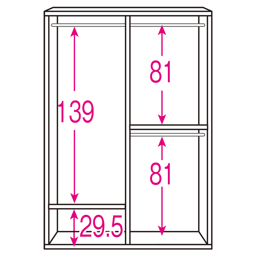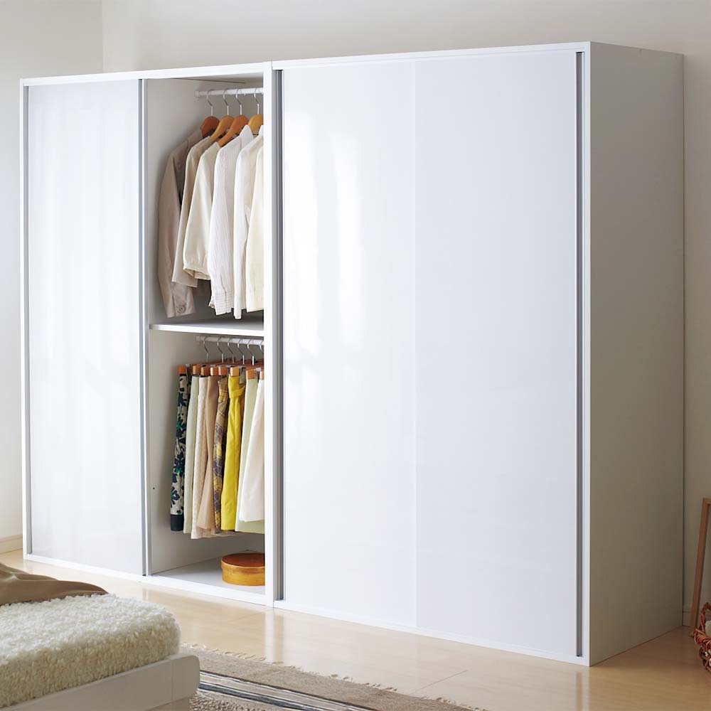 [日本製]開閉に場所をとらない引き戸仕様で光沢が美しいワードローブ。扉の開閉スペースが不要で狭い場所でも使える引き戸仕様の衣類収納。 棚板・ハンガーバーの位置は用途に合わせて調整が可能です。開閉スペース不要の引き戸&大量収納のシンプルなワードローブ●狭いスペースでも開閉が可能。場所をとらない引き戸式のワードローブ・クローゼットです。●寝室や廊下、ウォークインクローゼットなどに最適です。●壁面収納として、また主力の洋服ダンスの代わりに頼れる収納力があります。収納したい物に合わせてハンガーバー・棚の位置が設定できます●「バッグを置く収納棚が上」「靴を置くので棚は下がいい」など組立時に設定が可能です。●ロング丈のコートが多い方も大量収納できるのでおすすめです。●2段のハンガーラックにもなるので、ジャケットやパンツハンガーとしても使えます。清潔感のある光沢仕上げで圧迫感を感じないシンプルデザイン●場所をとらない引き戸の扉には光沢があり、お部屋を明るく清潔感のある雰囲気に。●素材はポリエステル化粧合板を使用、汚れに強く、お手入れがとても簡単です。●シンプルで飽きのこないデザインはインテリアのテイストを選びません。国内の職人が丁寧に仕上げたMade in Japan(国産品)●国内の工場で仕上げた安心の人気商品です。●たくさん洋服が収納できますので、毎日のおしゃれをより楽しんでいただけます。〜シリーズ累計5000台突破!嬉しい口コミが届いています!〜◇思っていた以上にシッカリした作りで、光沢も綺麗で値段の割に良い製品でした。(東京都 男性)◇商品画像そのままの見た目。引き戸もスルスル開閉できます。このお値段で引き戸のワードローブはお買い得だと思います。(神奈川県 女性)※お買い上げいただいたお客様個人の感想です