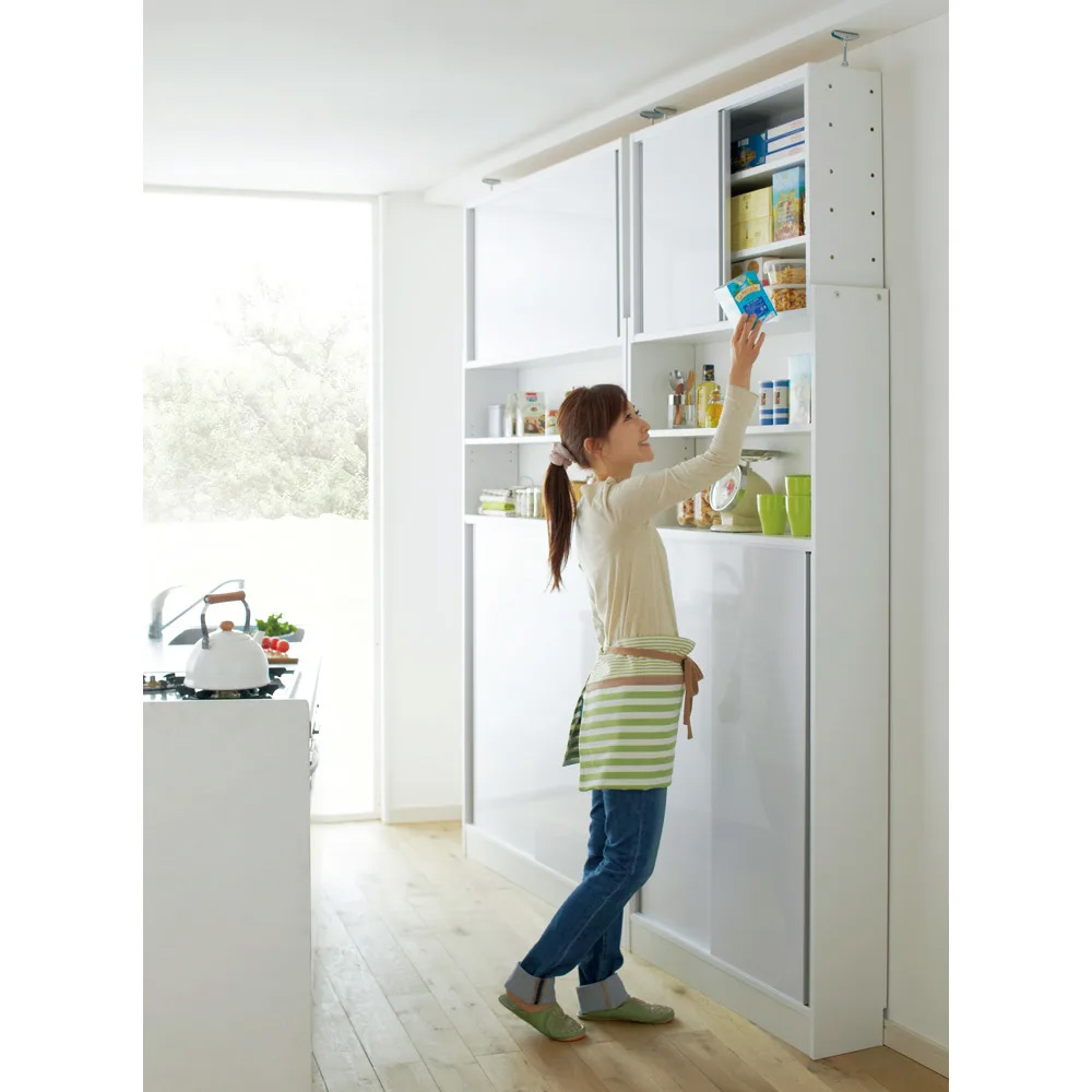 (ア)ホワイト 収納庫を使っていてもすれ違うことが出来るので、マンションやシステムキッチンのお家にもおすすめです。