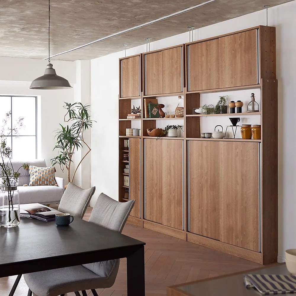 コーディネート例(ア)ホワイト 安定感のある突っ張り式。開けるスペースが必要な扉と違い、引き戸式なので開閉に場所を取りません。 ※写真は別売りの奥行30cm・幅60cm・幅120cmタイプです。