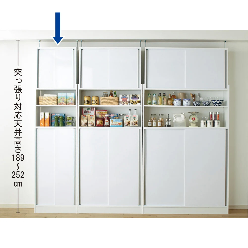 わずか奥行30cmの突っ張り薄型食器棚で便利に大量収納!引き戸扉なので開閉にもスペース要らず。つっぱり式で天井いっぱいまでの壁面収納家具として。コーディネート例(ホワイト 左:幅120cm、右:幅60cm)大量のストックを隠せる「薄型×引き戸」キッチン収納狭いキッチンでも置ける、奥行30cmの薄型引き戸パントリー収納庫。仕舞う場所に困る食材のストックや調味料、食器類などをすっきり収納し、引き戸でサッと目隠し。突っ張り式で薄型なので、人の行き来の多い場所でも邪魔になりません。光沢感のあるデザインがキッチンを明るく保ちます。※赤文字は内寸(単位:cm) 本体内寸奥行24cm ※引き戸を外して撮影わずか奥行30cmの隙間家具シンプルなデザインなのでどんなキッチン・リビングでも似合う隙間家具です。サイズバリエーションが豊富なのでうまく組み合わせて壁面いっぱいの収納棚としてご活用ください。幅60・90・120cmの3タイプがあります。※お届け商品は「幅60cmタイプ」です。コーディネート例(左から幅60cm・90cm・120cm)たっぷり収納できて安定感のある突っ張り式突っ張り式はキッチンの天井いっぱいまで収納でき、キッチンストッカーや食器棚として便利です。「引き戸・薄型」だから狭い場所でも便利開けるスペースが必要な扉と違い、引き戸式なので開閉に場所を取りません。狭いキッチンでも使いやすく活躍します!使用例(ブラウン 幅120cm)狭い廊下にも設置可能薄型だから、廊下に置けば家庭用品のストレージスペースとして有効活用できます。 棚板を外せば掃除機も収納できます。引き戸式なので開閉に場所を取らず、狭い廊下での出し入れもラク。 オープン部の収納棚には、良く使う雑貨やちょっとしたインテリアを置いてもオシャレです。使用例(ブラウン 幅90cm)洗面所の限られたスペースにも棚板は全て可動式(3cmピッチ)で収納物のサイズに合わせて調節可能。タオルや洗剤などもたっぷり収納できます。ストック収納に便利な奥行30cm箱入りの飲料はそのまま、2リットルのペットボトルは2列に入る大容量。使いやすい工夫・オープン部は背板がなく、棚板の位置を調整すれば、壁面にスイッチがあってもよけられます。・足元は幅木よけカットが施してあるので壁にピッタリと設置できます。安全性にも配慮・安定感のある突っ張り式。突っ張り部は専用の金具で微調整が可能です。189cmと低い天井から突っ張る事ができます。・突っ張らずに転倒防止金具で固定することもできます。高級感のあるホワイト・お部屋に馴染むブラウン・ホワイトは、前面に美しい光沢感のある素材(ポリエステル化粧合板・光沢仕上げ)を使用しています。ポリエステル化粧合板は水ハネ・汚れに強く、お手入れが簡単なのでキッチンに適しています。・ナチュラルなブラウンは、廊下やリビングにも馴染見やすいカラー。・組立時間は大人2人で約40分程度です。
