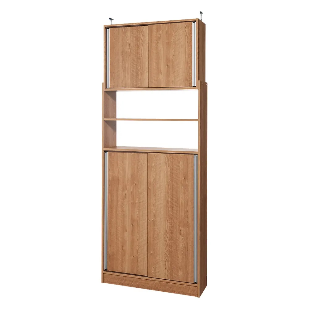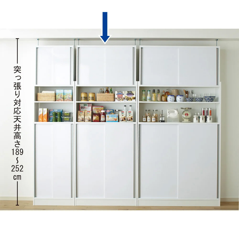わずか奥行30cmの突っ張り薄型食器棚で便利に大量収納!引き戸扉なので開閉にもスペース要らず。つっぱり式で天井いっぱいまでの壁面収納家具として。コーディネート例(ホワイト 左:幅60cm、右:幅90cm)大量のストックを隠せる「薄型×引き戸」キッチン収納狭いキッチンでも置ける、奥行30cmの薄型引き戸パントリー収納庫。仕舞う場所に困る食材のストックや調味料、食器類などをすっきり収納し、引き戸でサッと目隠し。突っ張り式で薄型なので、人の行き来の多い場所でも邪魔になりません。光沢感のあるデザインがキッチンを明るく保ちます。※赤文字は内寸(単位:cm) 本体内寸奥行24cm ※引き戸を外して撮影わずか奥行30cmの隙間家具シンプルなデザインなのでどんなキッチン・リビングでも似合う隙間家具です。サイズバリエーションが豊富なのでうまく組み合わせて壁面いっぱいの収納棚としてご活用ください。幅60・90・120cmの3タイプがあります。※お届け商品は「幅90cmタイプ」です。コーディネート例(左から幅60cm・90cm・120cm)たっぷり収納できて安定感のある突っ張り式突っ張り式はキッチンの天井いっぱいまで収納でき、キッチンストッカーや食器棚として便利です。「引き戸・薄型」だから狭い場所でも便利開けるスペースが必要な扉と違い、引き戸式なので開閉に場所を取りません。狭いキッチンでも使いやすく活躍します!使用例(ブラウン 幅120cm)狭い廊下にも設置可能薄型だから、廊下に置けば家庭用品のストレージスペースとして有効活用できます。 棚板を外せば掃除機も収納できます。引き戸式なので開閉に場所を取らず、狭い廊下での出し入れもラク。 オープン部の収納棚には、良く使う雑貨やちょっとしたインテリアを置いてもオシャレです。使用例(ブラウン 幅90cm)洗面所の限られたスペースにも棚板は全て可動式(3cmピッチ)で収納物のサイズに合わせて調節可能。タオルや洗剤などもたっぷり収納できます。ストック収納に便利な奥行30cm箱入りの飲料はそのまま、2リットルのペットボトルは2列に入る大容量。使いやすい工夫・オープン部は背板がなく、棚板の位置を調整すれば、壁面にスイッチがあってもよけられます。・足元は幅木よけカットが施してあるので壁にピッタリと設置できます。安全性にも配慮・安定感のある突っ張り式。突っ張り部は専用の金具で微調整が可能です。189cmと低い天井から突っ張る事ができます。・突っ張らずに転倒防止金具で固定することもできます。高級感のあるホワイト・お部屋に馴染むブラウン・ホワイトは、前面に美しい光沢感のある素材(ポリエステル化粧合板・光沢仕上げ)を使用しています。ポリエステル化粧合板は水ハネ・汚れに強く、お手入れが簡単なのでキッチンに適しています。・ナチュラルなブラウンは、廊下やリビングにも馴染見やすいカラー。・組立時間は大人2人で約40分程度です。