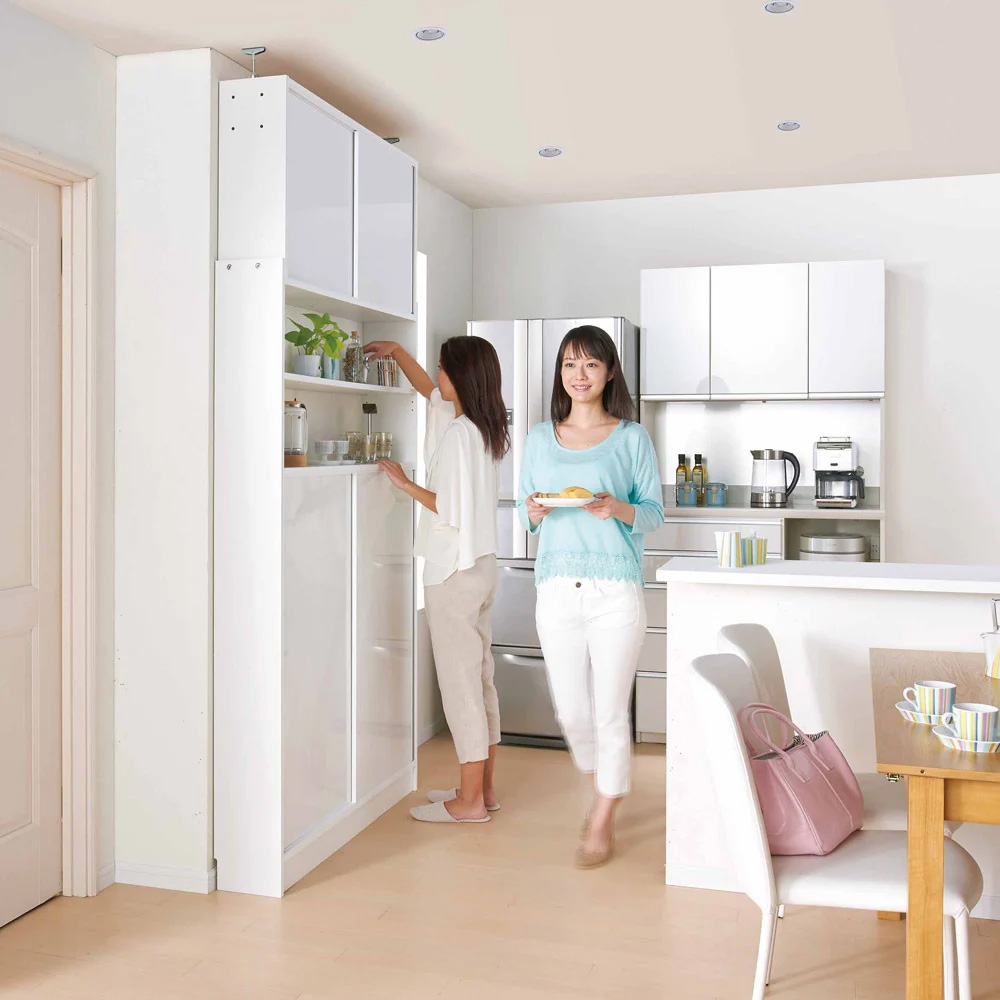 (ア)ホワイト 収納庫を使っているときもすれ違うことが出来る薄型引き戸設計なので、マンションやシステムキッチンのお家にもおすすめです。