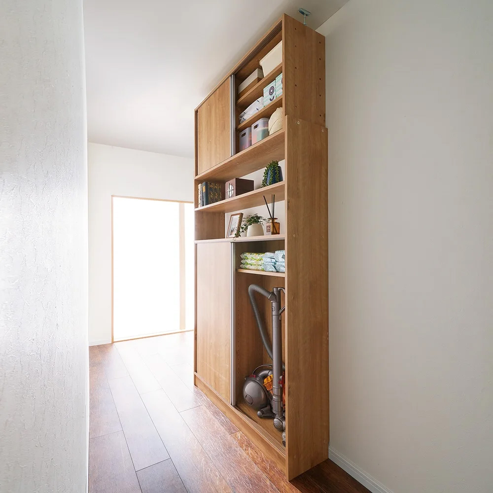 (イ)ブラウン 狭い廊下にも 棚板を外せば掃除機も収納できます。薄型だから廊下を家庭用品のストレージスペースとして有効活用できます。引き戸式なので開閉に場所を取らず、狭い廊下での出し入れもラク。 ※写真は幅120cmタイプ