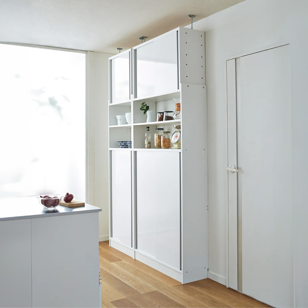 コーディネート例(ア)ホワイト 安定感のある突っ張り式。開けるスペースが必要な扉と違い、引き戸式なので開閉に場所を取りません。 ※写真は別売りの奥行30cm・幅60cm・幅120cmタイプです。