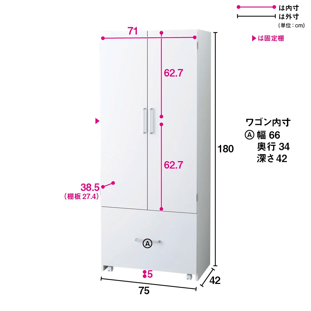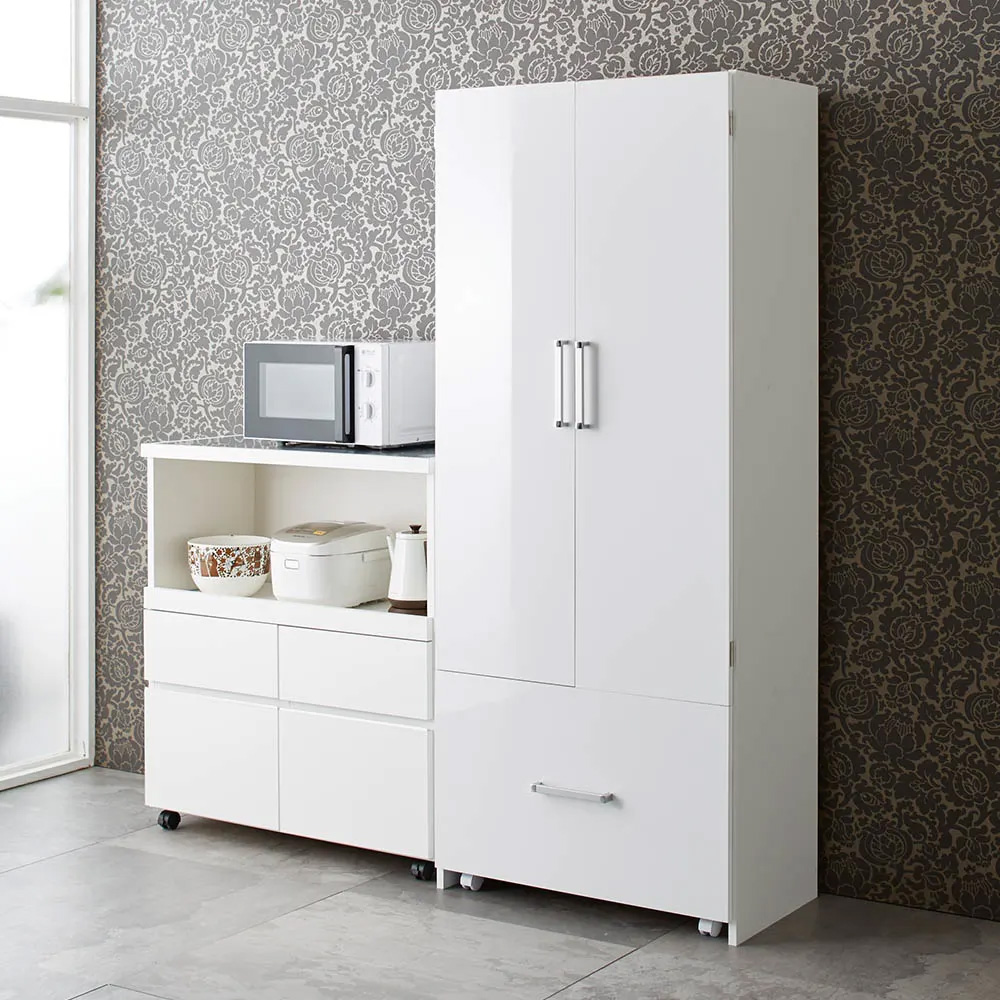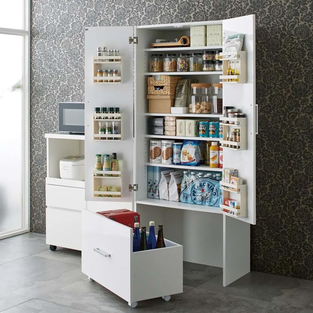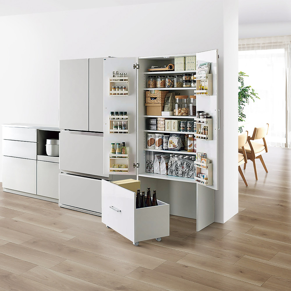 お客様の声がきっかけで商品化した人気商品。キッチンストッカーにワゴン収納が付いて使い勝手が大幅アップ。キッチンのすき間に合わせて選べて、サブの食器棚としての使用もおすすめです。【キッチンストッカーと頑丈ワゴンを一緒に】◆ダストボックス・お米・食品・調味料・ペットボトル・一升瓶・鍋・フライパンなど、色々な物が収納できる頑丈ワゴン付きアイデア商品です!◆扉が大きく開くので、収納物が見やすく、同じ食品を間違えて買ってしまったり、賞味期限切れなどのミスが減らせます。◆大人気のドアポケット付きストッカーに頑丈ワゴンをセットして使い勝手アップ!◆最下段にペットボトルやゴミ箱を入れてもOKです。◆キッチンのすき間をぴったりなサイズを選べる隙間収納家具です。◆人気のワゴン部の有効内寸高さは42cmで、一升瓶も入ります。【2台目の食器棚として使いやすい機能満載】◆前面はポリエステル化粧合板(光沢仕上げ)を使用。お手持ちの食器棚と並べても馴染むデザインです。◆台所の事を考え水ハネや汚れも簡単に拭き取れる素材です。◆収納部は可動式の収納棚板4枚付き(上から1・2・4・5段目)◆食器棚と冷蔵庫の間のすき間スペースに合わせて置ける省スペースサイズもご用意。◆幅30・45cmタイプは扉を左右どちら向きにでも設定可能。キッチンのすき間に合わせて設定してください。◆収納部とワゴン部は仕切られているので匂いを心配する事もありません。◆ペールは付属していません。【安心と信頼の国内生産品】◆国内の家具職人が丁寧に仕上げた逸品です。◆国産品ならではの品質をお楽しみください。