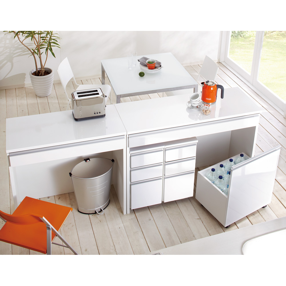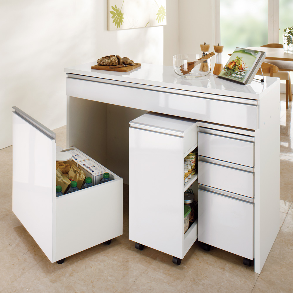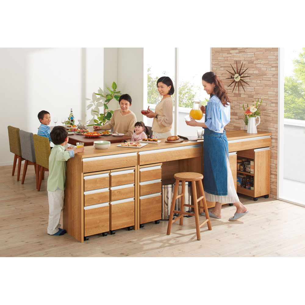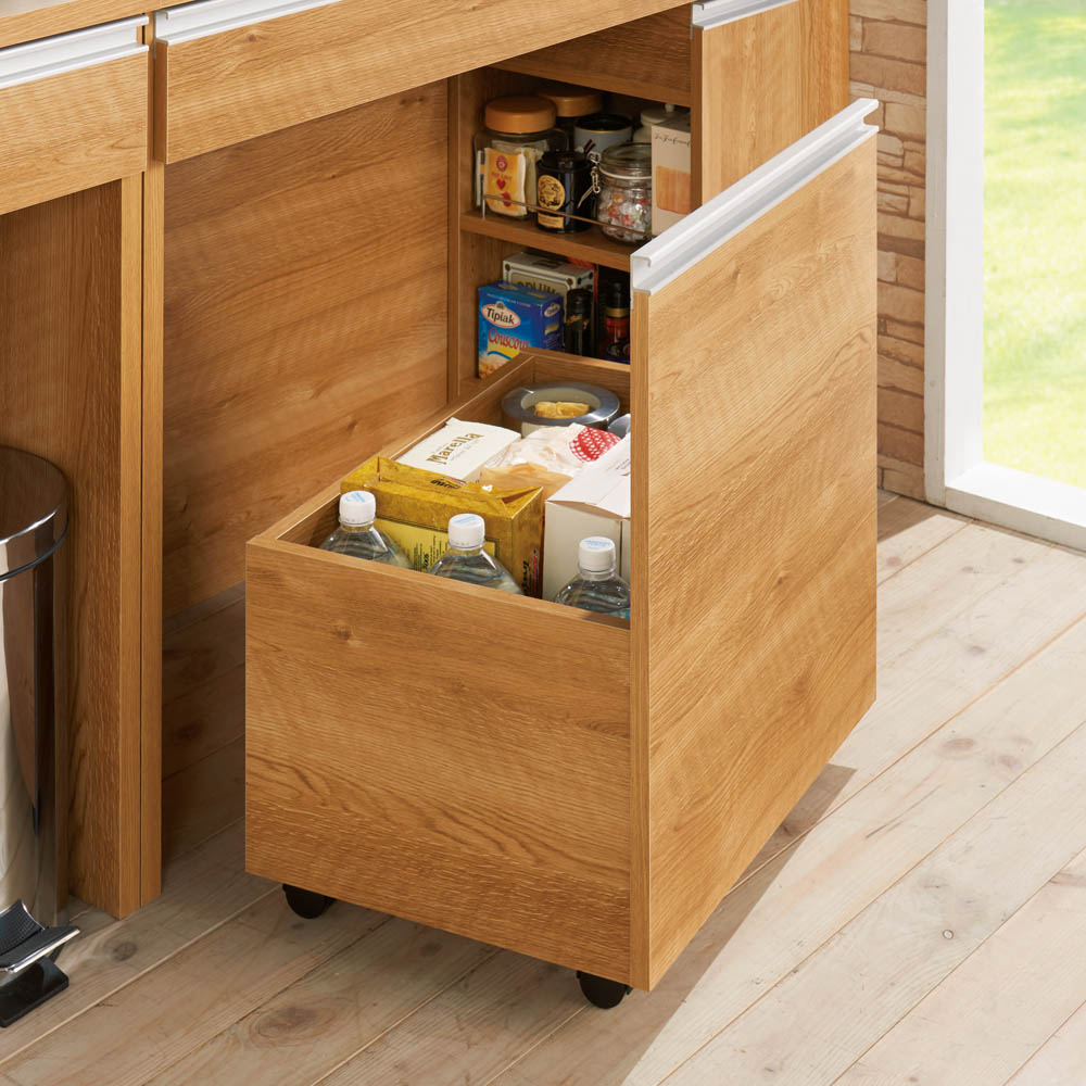 キッチンを有効活用する間仕切りができるキッチンカウンターの下に収納できるキャスター付き頑丈ワゴンです。清潔感あふれるカウンター下のオープンスペースを有効活用できます。食品のストックスペースやゴミ箱の収納にもぴったり。狭いキッチンで活躍するキャスター付き頑丈ワゴン◆キャスター付きなので、必要な時だけ引き出せます。◆ワゴンの耐荷重量は約30kgで、重い飲料のペットボトルや分別ゴミ箱も安心して収納できます。◆ホワイトの前面の素材は、お手入れが簡単な素材を採用。サッとひとふきでパッとキレイに。◆キャスター付きでラクラク移動できるので掃除も楽にできます。幅54cmでも収納力は◎◆収納部の有効内寸は幅50奥行36高さ59(側板高さは27.5cm)cmです。2リットルのペットボトルがちょうど12本入ります。◆食品や飲料のストックを収納する以外にも、分別のダストボックスを収納するのもおすすめです。信頼と安心の国内生産◆国内の家具工場で生産しています。◆すき間を利用して効率の良い収納術を実践できます。〜選べる2色展開〜◆天板と引き出しが光沢のホワイトと、木目調のブラウンの2色をご用意しました。◆キッチンはもちろん、リビングや子供部屋、書斎にも馴染みます。