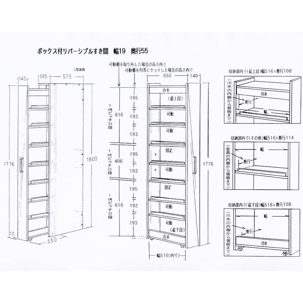 ボックスでキッチンや洗面所のすき間を目隠し&ホコリを防いで清潔。組立時にホワイトかシルバーの前面カラーが選べるリバーシブルタイプ。棚板は1cmピッチで収納物に合わせて。幅20cm以下でも収納できる隙間家具。目隠ししながらホコリを防いでスマートに収納力アップ◆たった15cmからの隙間がキッチンストッカーに変身します。◆多くのお客様にご好評を頂いているディノスの人気のキッチン収納のアイデア商品です。◆前面は光沢感があり、汚れにくく、お手入れし易いポリエステル化粧合板素材で作りました。◆ワゴンをボックスに仕舞えば目隠しでスッキリ。すき間を利用して収納上手にさせるキッチン収納です。◆すっきり隠せてホコリを防ぐボックスタイプは急な来客にも安心です。◆収納棚板の高さはお好みに合わせて1cm間隔で調整できるので収納物に合わせて調整可能です。隙間家具でも妥協したくないあなたに高機能を◆選べる幅と奥行きのサイズ展開であなたのキッチンにピッタリなサイズをお選び下さい。◆前面(取っ手のある部分)はホワイト・シルバーのどちらにも設定可能。◆棚板には収納物が落ちないように落下防止バーが付いています。(最下段は除きます)◆ワゴンにはキャスターが付いているので開け閉めが簡単になっています。◆もちろんオープン部の向きは左右どちらでも設定可能で置く場所を選びません。◆清潔感のあるホワイトでおしゃれなシンプルモダンキッチンを演出します。信頼と安心の国内工場での生産品です◆国内の職人がひとつずつ丁寧に仕上げた逸品です。◆細部の丁寧な仕上がりなど、国産品ならではの高品質をお楽しみください。◆キッチンのすきまを無駄なく使いたいあなたにお勧めのキッチン収納ラックです。新築やリフォーム、模様替えの時にもおすすめの逸品◆お引越しや模様替えのタイミングでスペースを便利に有効活用してみませんか?◆高価な備え付け家具やリフォームよりも、リーズナブルに新生活を始められます。◆是非普段使うものこそ、大好きなものをじっくりとご検討下さい。