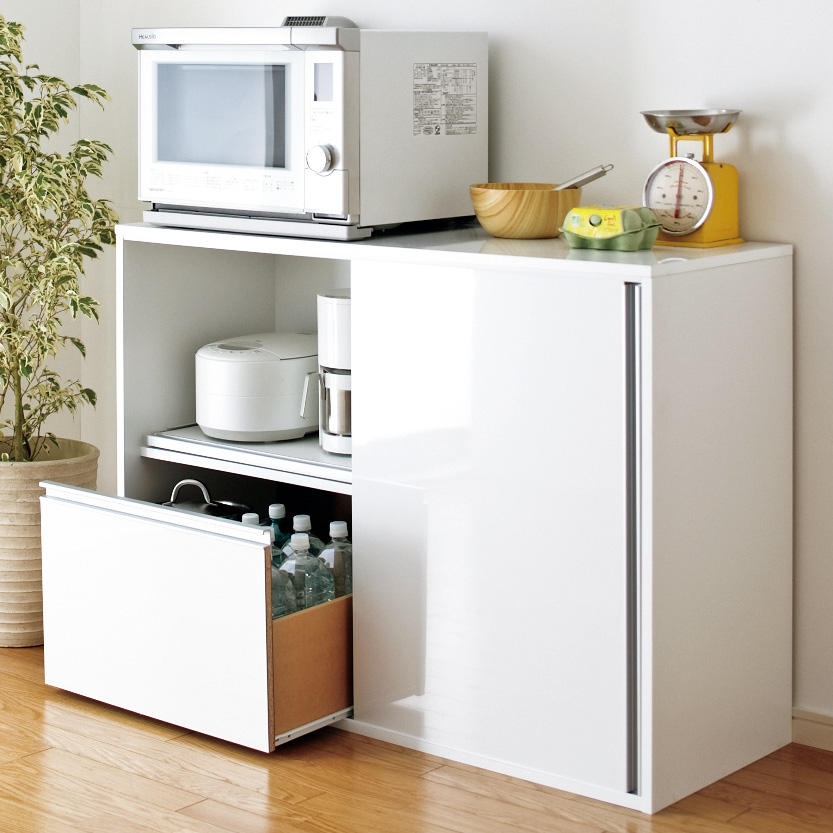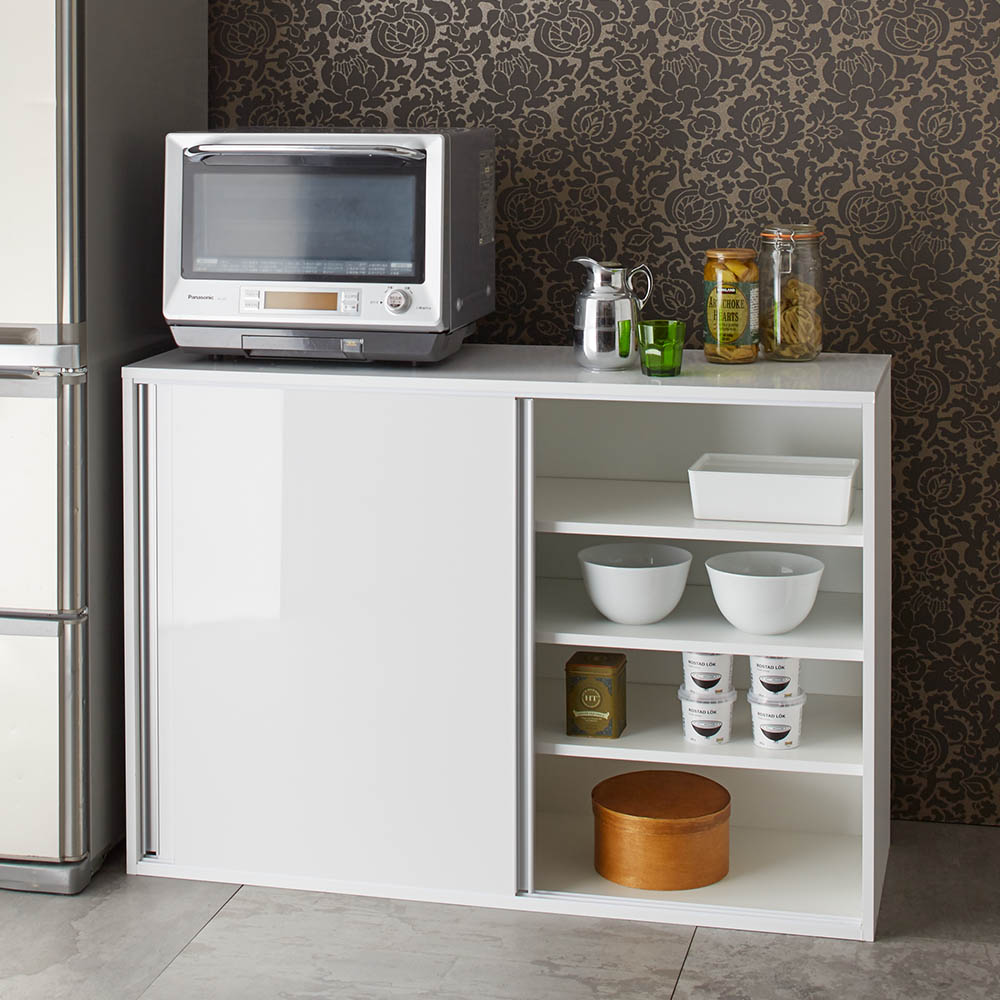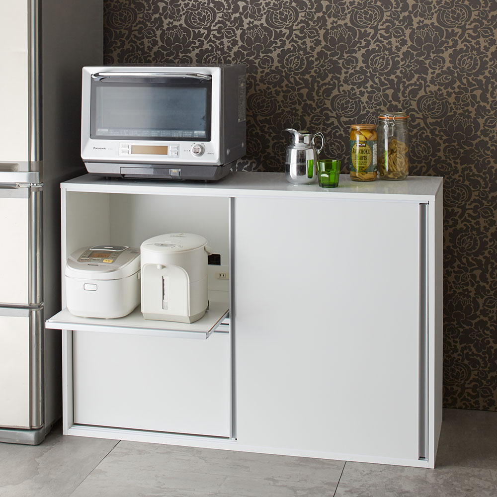 キッチン家電や食器をサッと目隠しできる大型レンジ対応キッチンカウンターです。引き戸だから扉が前に出ず省スペース。1台でレンジ台・食品ストッカー・食器棚と収納力たっぷりにお使いいただけるキッチン収納の決定版です。大型スチームレンジに電気ポット、多機能ホットプレートやホームベーカリーなど、便利なキッチン家電が増えています。毎日のお料理にぜひ活用したいものですが、困ってしまうのが収納場所ではないでしょうか。そんな便利なキッチン家電をすっきり使いやすく収納できるのがこの商品。ロータイプは大型レンジに対応、ハイタイプなら3段のスライドテーブルでいろいろなキッチン家電をひとまとめに収納できます。引き戸なので、「見せる」「隠す」も自由自在。コンセントやスライドテーブルなど、キッチン家電を置くための機能も充実しています。もちろん、食器棚としての活用もOK!レンジ台としても収納庫としても大活躍します。