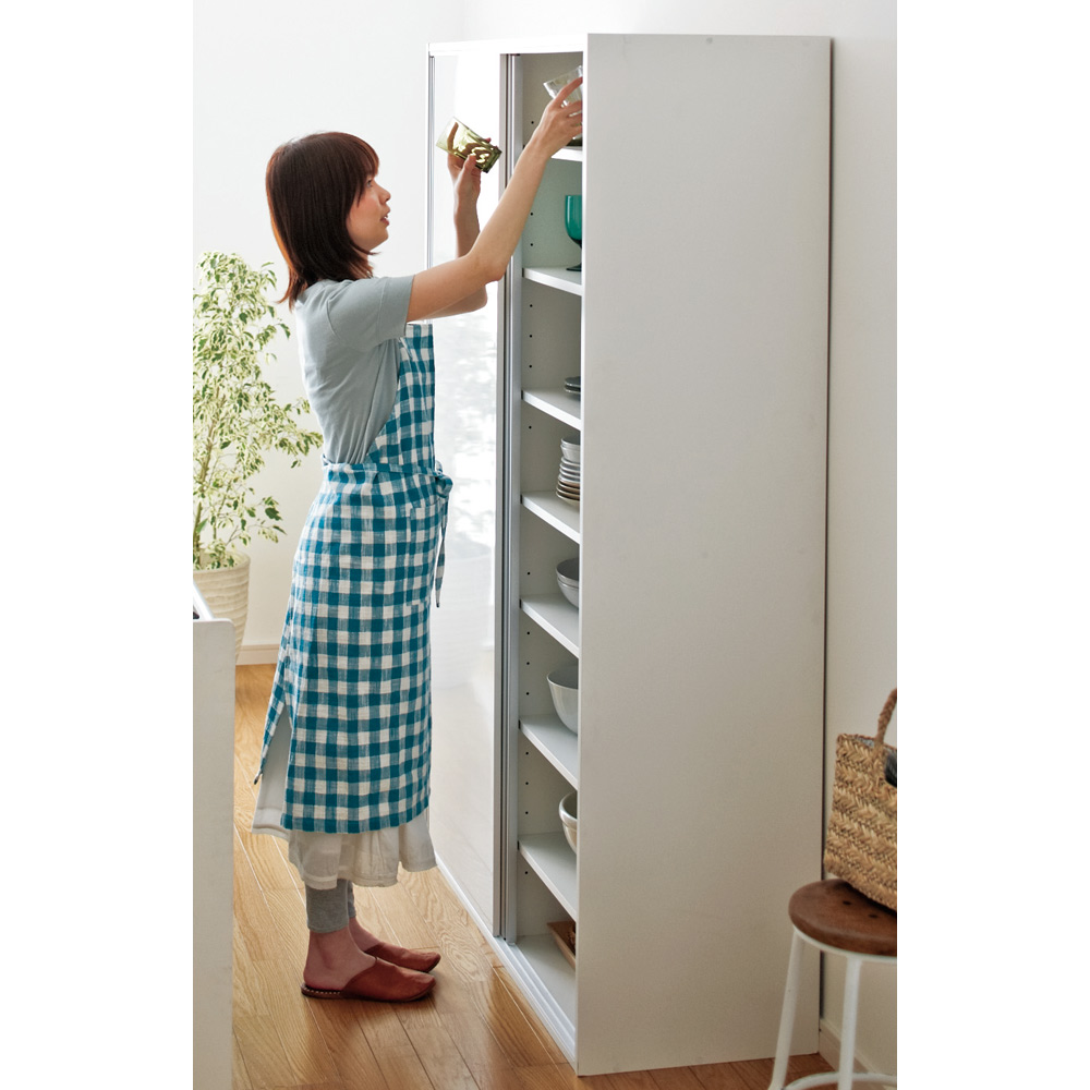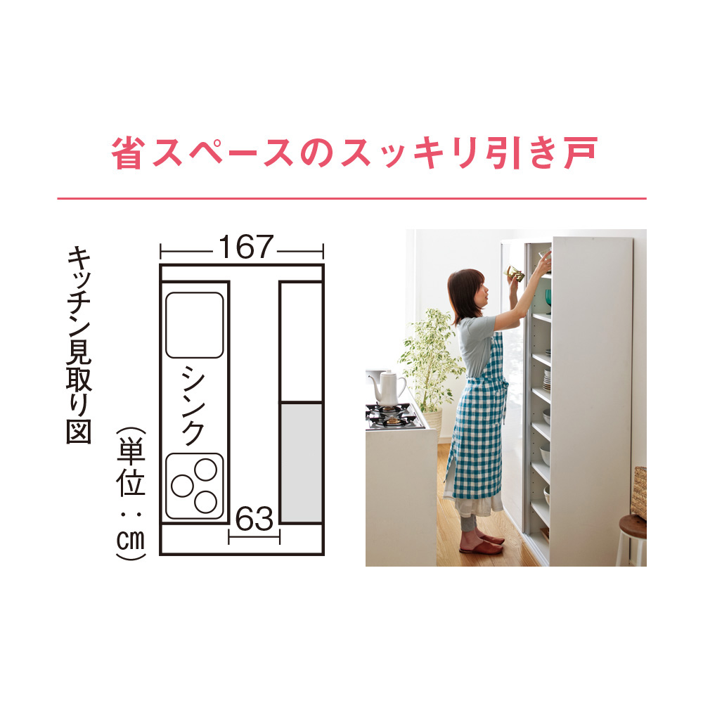 開閉に場所をとらない引き戸は狭いキッチンに最適です。(※写真はハイタイプです。)