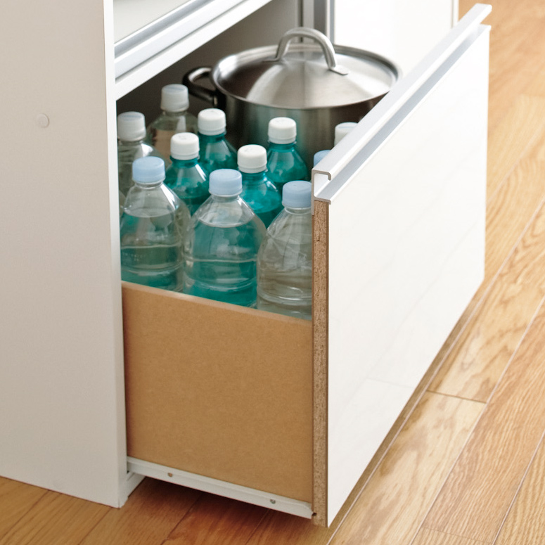 引き出しはストッパー付きスライドレール仕様なので重さのあるものも収納可能。ペットボトルのストックや鍋置き場に丁度いいサイズです。