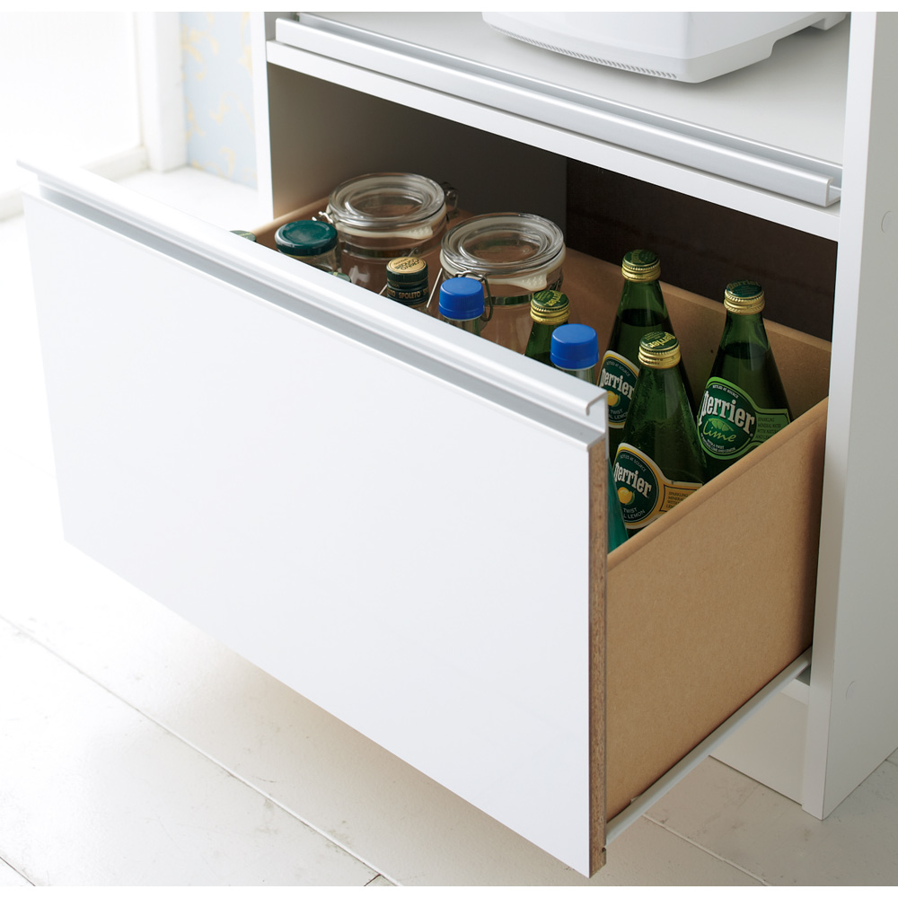 引き出しはペットボトルも入る高さの大容量タイプ。スライドレール付で引き出しもスムーズです。
