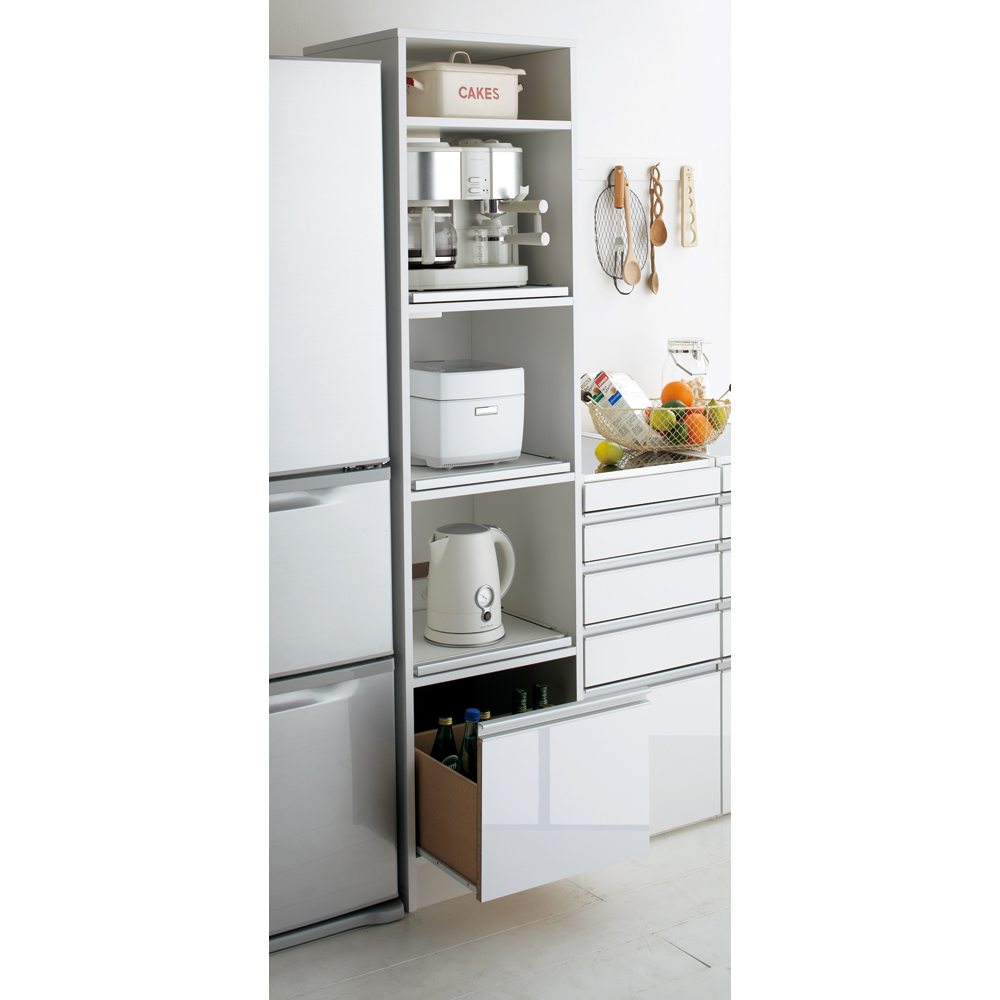 隙間に合わせて幅が選べるレンジラック。スライドテーブル3段付きで好きな場所によく使う家電を設置できるレンジ台。キッチン収納に1台欲しいおすすめ商品です。キッチン家電の収納場所はここに決まり!!◆電子レンジ、炊飯器、オーブン、ホットプレート、コーヒーメーカーなどよく使う家電のキッチン収納家具が誕生しました。◆手前に引き出せるスライドテーブルをなんと3段も標準装備しました!蒸気の出る家電に便利です。◆家電を縦に収納することで調理スペースが広がるキッチン収納のアイディア満載のキッチンラックです。◆前面はお手入れしやすい素材を使用していますので台所での汚れや水ハネも拭き取れます。◆一番下の引き出しにはボトルやストック類を仕舞えるキッチンストッカーです。使い易さにこだわったキッチン隙間収納家具◆扉の無いオープンタイプのレンジ台なので必要な時にすぐに使えます。◆引き出しは2Lのペットボトルが収納できる高さに設計しました。◆引き出しの全面は水ハネや汚れに強いポリエステル化粧合板(光沢仕上げ)。お手入れが簡単です。◆計1500Wの2口コンセントがついています。◆最上段には置き場に困るホットプレートやカセットコンロを収納できます。(すきまサイズを計測してください)◆万が一の揺れに備えて転倒防止金具付です。幅30cm〜60cmまで家電のサイズ、すきまのサイズに合わせて選べます。◆「我が家のキッチンは狭いから…」と、お悩みの方へ朗報です。◆縦型4分別タイプは幅55cmとスリムに設計しました。新築やリフォーム、模様替えの時にもおすすめの逸品◆お引越しや模様替えのタイミングでスペースを便利に有効活用してみませんか?◆高価な備え付け家具やリフォームよりも、リーズナブルに新生活を始められます。◆スキマを利用して効率の良い収納術を実践できます。◆是非普段使うものこそ、大好きなものをじっくりとご検討下さい。信頼と安心の国内生産品◆国内の家具職人が設計し、ひとつずつ丁寧に仕上げました。◆国産品ならではの高品質をお楽しみください。◆組立は大人2人で40分以内、有料組立サービスも承っております。