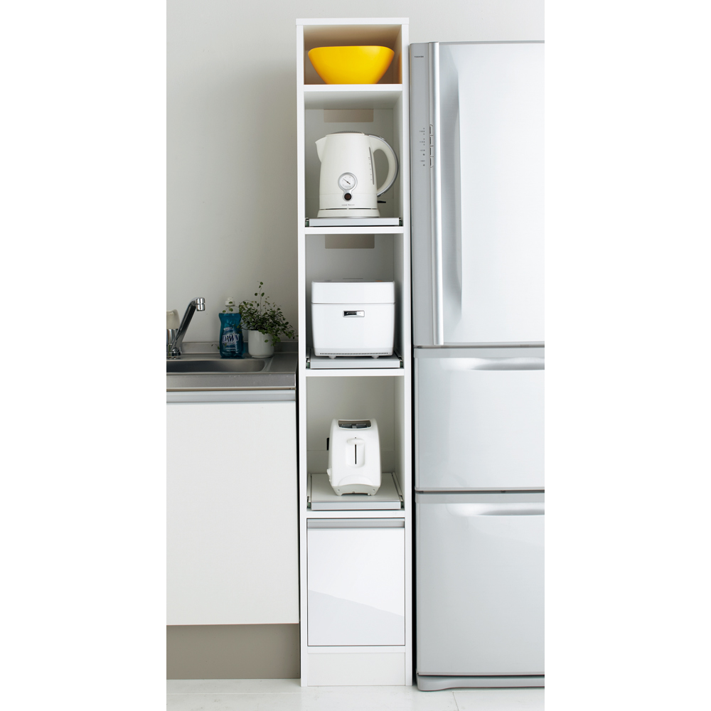 隙間に合わせて幅が選べるレンジラック。スライドテーブル3段付きで好きな場所によく使う家電を設置できるレンジ台。キッチン収納に1台欲しいおすすめ商品です。キッチン家電の収納場所はここに決まり!!◆電子レンジ、炊飯器、オーブン、ホットプレート、コーヒーメーカーなどよく使う家電のキッチン収納家具が誕生しました。◆手前に引き出せるスライドテーブルをなんと3段も標準装備しました!蒸気の出る家電に便利です。◆家電を縦に収納することで調理スペースが広がるキッチン収納のアイディア満載のキッチンラックです。◆前面はお手入れしやすい素材を使用していますので台所での汚れや水ハネも拭き取れます。◆一番下の引き出しにはボトルやストック類を仕舞えるキッチンストッカーです。使い易さにこだわったキッチン隙間収納家具◆扉の無いオープンタイプのレンジ台なので必要な時にすぐに使えます。◆引き出しは2Lのペットボトルが収納できる高さに設計しました。◆引き出しの全面は水ハネや汚れに強いポリエステル化粧合板(光沢仕上げ)。お手入れが簡単です。◆計1500Wの2口コンセントがついています。◆最上段には置き場に困るホットプレートやカセットコンロを収納できます。(すきまサイズを計測してください)◆万が一の揺れに備えて転倒防止金具付です。幅30cm〜60cmまで家電のサイズ、すきまのサイズに合わせて選べます。◆「我が家のキッチンは狭いから…」と、お悩みの方へ朗報です。◆縦型4分別タイプは幅55cmとスリムに設計しました。新築やリフォーム、模様替えの時にもおすすめの逸品◆お引越しや模様替えのタイミングでスペースを便利に有効活用してみませんか?◆高価な備え付け家具やリフォームよりも、リーズナブルに新生活を始められます。◆スキマを利用して効率の良い収納術を実践できます。◆是非普段使うものこそ、大好きなものをじっくりとご検討下さい。信頼と安心の国内生産品◆国内の家具職人が設計し、ひとつずつ丁寧に仕上げました。◆国産品ならではの高品質をお楽しみください。◆組立は大人2人で40分以内、有料組立サービスも承っております。