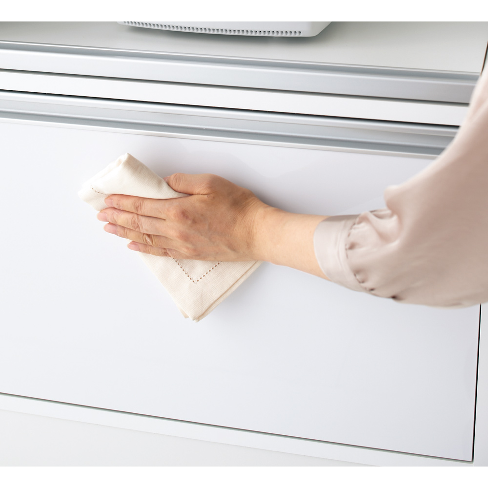 前面はお手入れが簡単なポリエステル化粧合板(光沢仕上げ)。