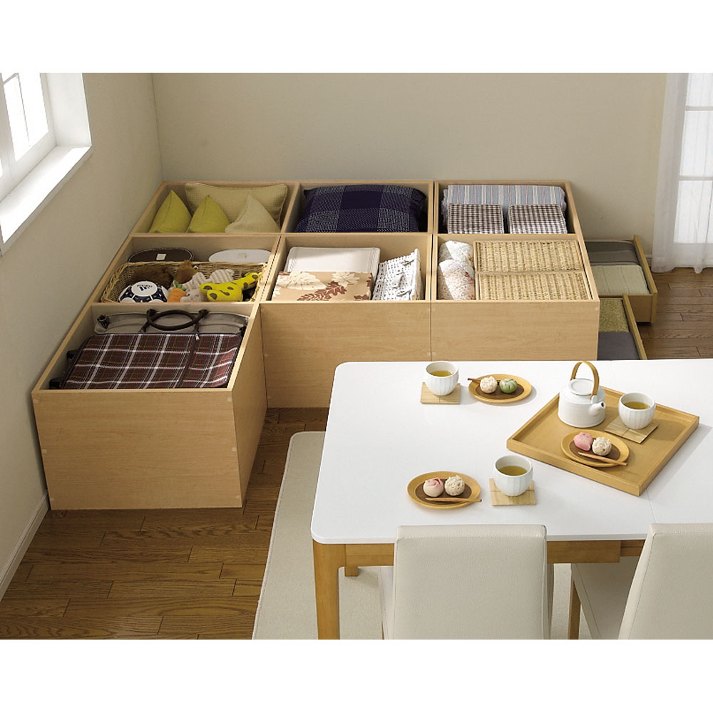 【左からミニ・半畳・1畳・1畳引出し付きの組み合わせ】高さ45cmはベンチとしても使用できます。写真はコーナー使用例。