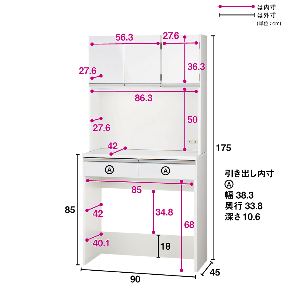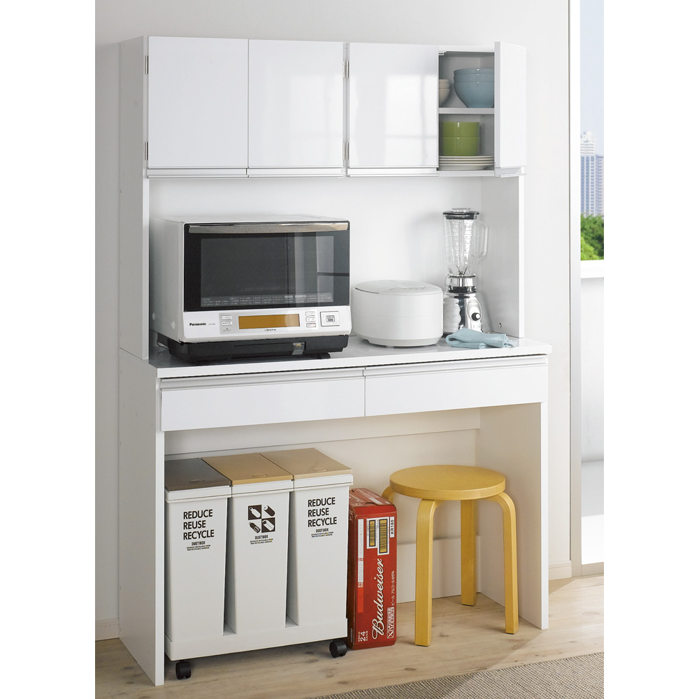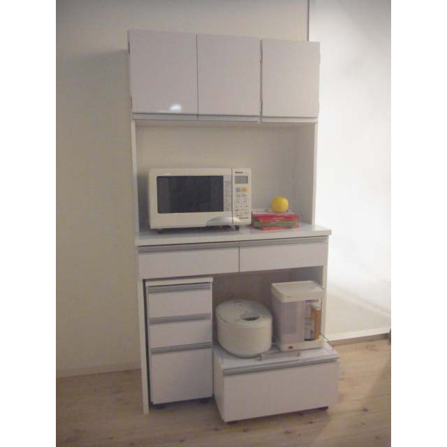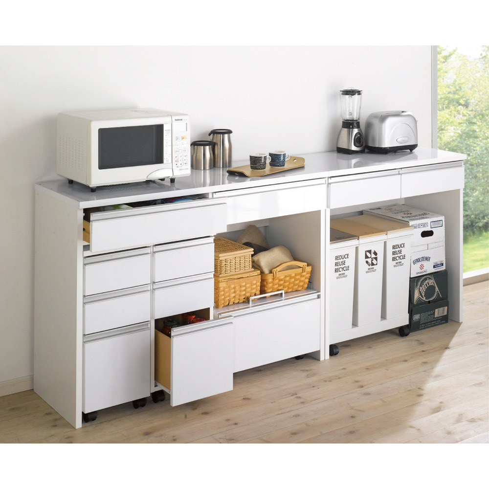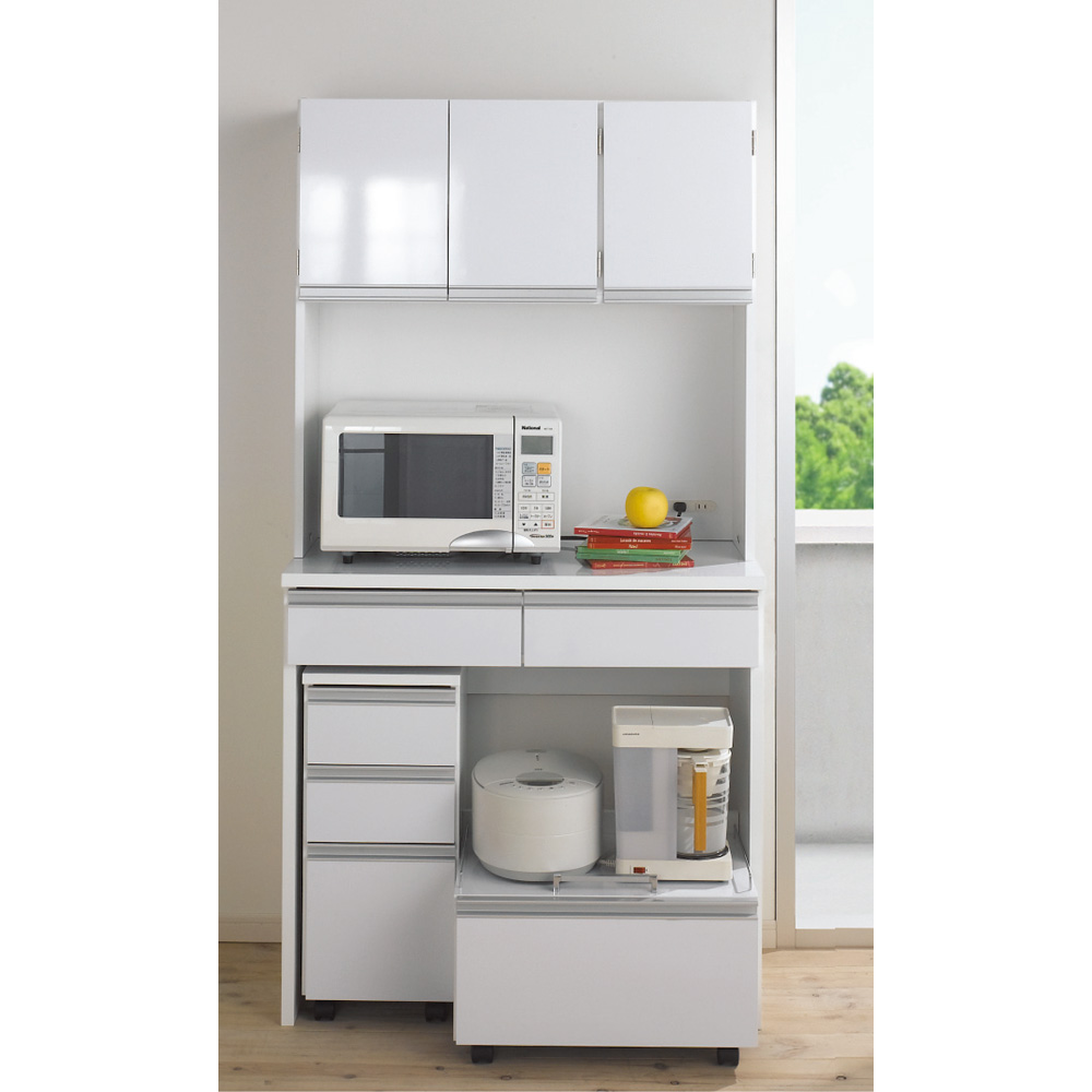 床置きできる「自由な空間」に買い置きのゴミ箱もすっきり収納できるレンジ台。通路を邪魔するダストボックスやビールケースなどはすべて下部分に収めて。ご要望にお応えして、下部分のオープンスペースの広さが選べるよう、サイズバリエーションが豊富になりました。使用例(キッチンボード幅90高さ175cm、カウンター下:左からチェスト、ワゴン)キッチンをすっきり!床置き収納できる「下オープン仕様」下部分を自由にカスタマイズできるキッチン収納シリーズのレンジボード。下がオープン仕様なので、床置きが可能。この「魔法の空間」に買い置きもダストボックスも収納してキッチンをすっきり。キッチンボード幅90高さ175cm(お届け商品のサイズ)調理家電・ストック類をまとめて収納棚・オープン部・引き出しとたっぷり収納して、床置き収納までできるレンジボード。広々とした中天板には大型レンジも設置可能。 2口コンセント(計1500W)付きなので、レンジや炊飯器を使う時に便利です。キッチンボードの幅は90cm・120cm、高さは175cm・190cmから選べます。使用例(左:カウンター幅90高さ100cm、左カウンター下:チェスト、ワゴン、右:キッチンボード幅120高さ190cm)キッチンに合わせてアレンジ「下オープンダイニングシリーズ」シリーズ商品のキッチンワゴンやチェスト、カウンターを組み合わせれば、より使いやすいキッチン収納に。使用例(キッチンボード幅120高さ175cm)大きいものもすっぽり収納カウンター下のオープン部には、収納に困るダストボックス、スツールや踏み台、ビールケースやウォータサーバーの替え置き等の大きいものも収納できます。狭いキッチンの通路も広々収納に困る大きな物で、ごちゃつきがちなキッチン通路も…カウンター下のオープン部に収納すればスッキリ広々。狭いキッチンでも歩きやすく安全を確保しやすい。キッチンに安心感と清潔感が生まれます。お手入れ簡単、清潔感のある光沢仕上げ天板・前面には光沢が美しく、水・汚れに強いポリエステル化粧合板(光沢仕上げ)を使用。水ハネや汚れも簡単に拭き取れます。お手入れ簡単な素材で、キッチンを明るく清潔に彩ります。可動棚板1枚付き棚板は高さ調節可能。差し込み式ダボにて固定します。引き出しの抜け落ちを防ぐ抜け落ち防止のストッパー付き仕様です。また、引き出し内部(底部)は化粧仕上げ。汚れを落としやすい仕様です。キッチンボード幅90高さ175cm(お届け商品のサイズ)信頼の国内生産品デザイナー、設計担当者と何度も交渉、サンプルチェックも繰り返し行い、厳しい基準をクリアした価値ある作りです。細部の丁寧な仕上がりなど、国産品ならではの高品質をお楽しみください。※組み立て商品です。組み立てが得意でない方は「有料組み立てサービス」をご利用ください。